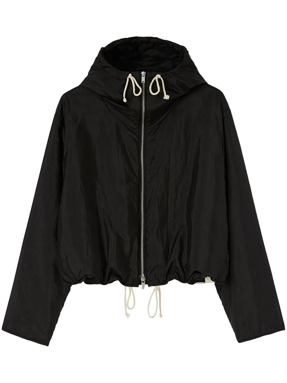 black padded design drawstring hood front two-way zip fastening two side slit pockets long sleeves drawstring hem cropped