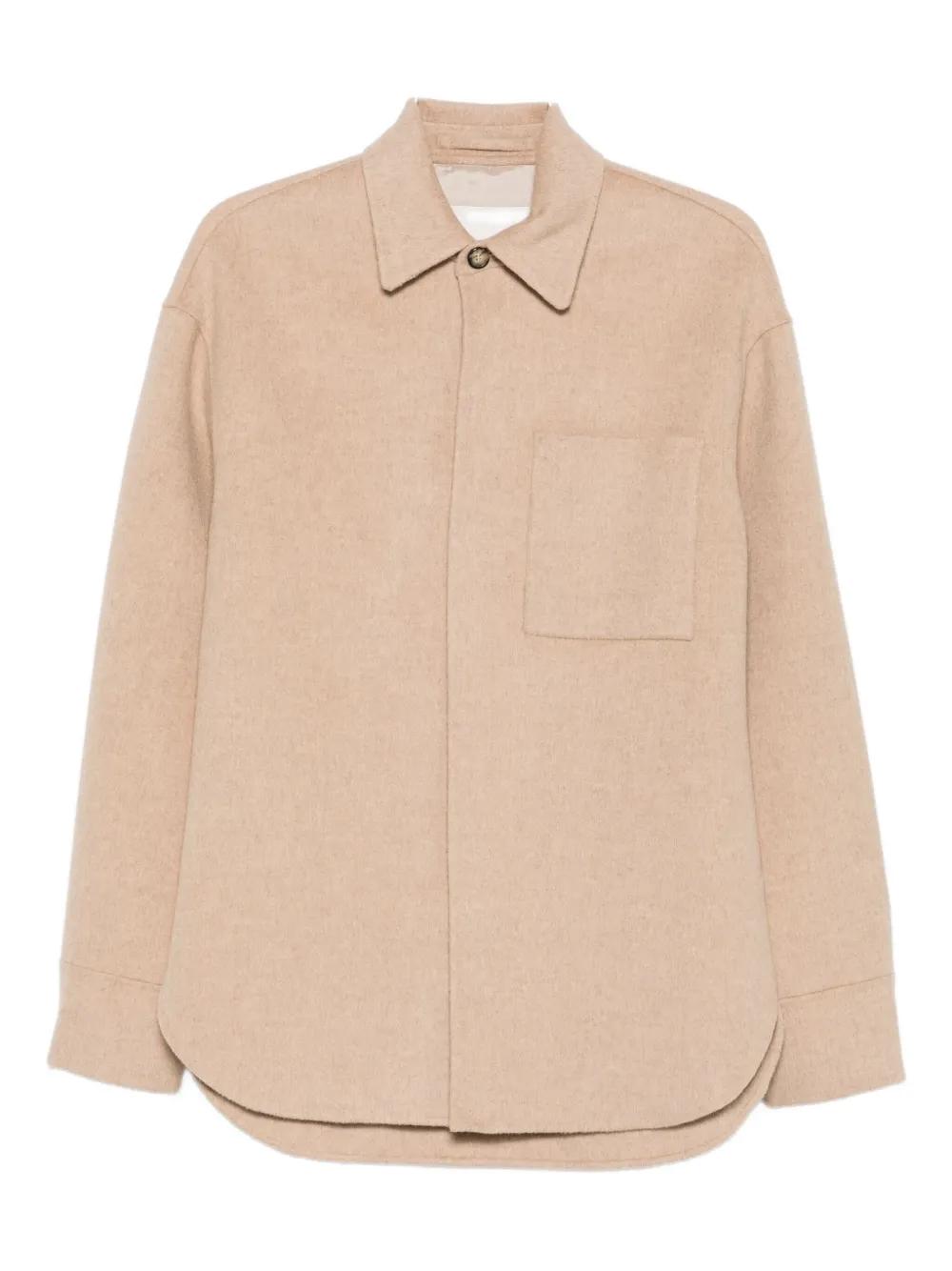 beige button front fastening patch pocket long sleeves curved hem collared neck