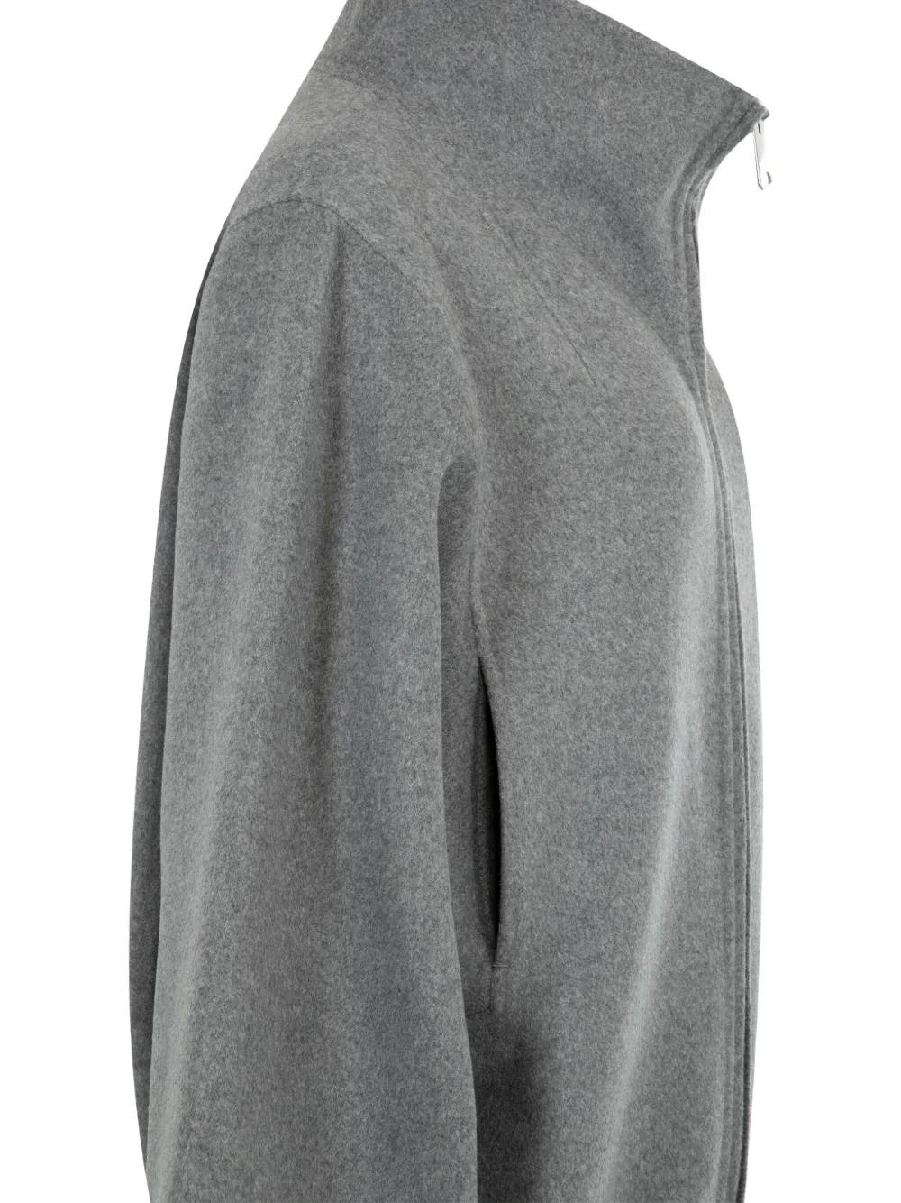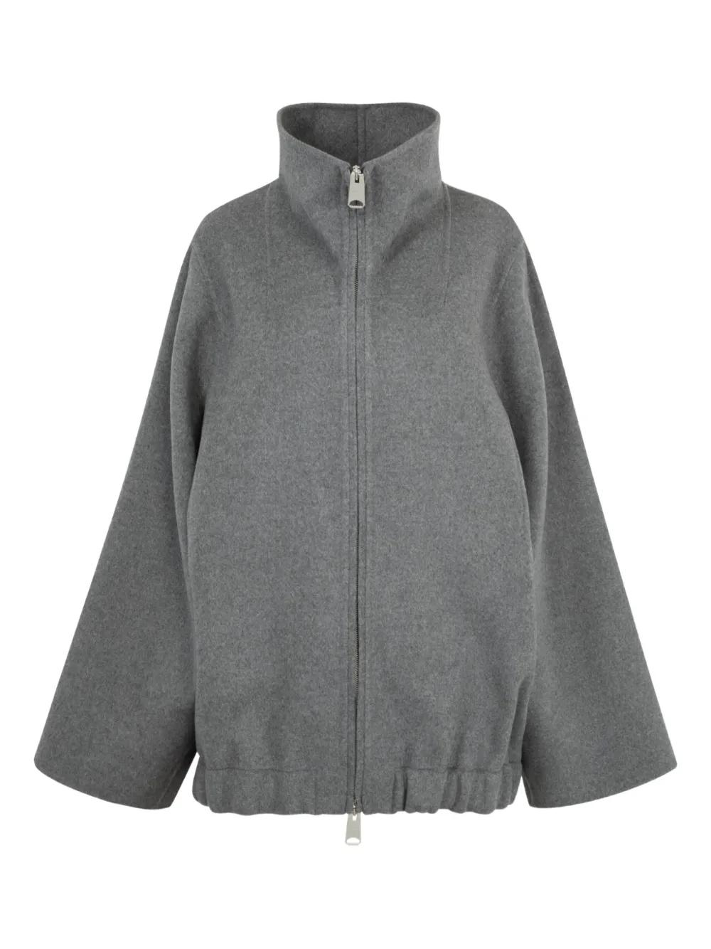 grey high neck zip front fastening wide sleeves elasticated hem welt pockets