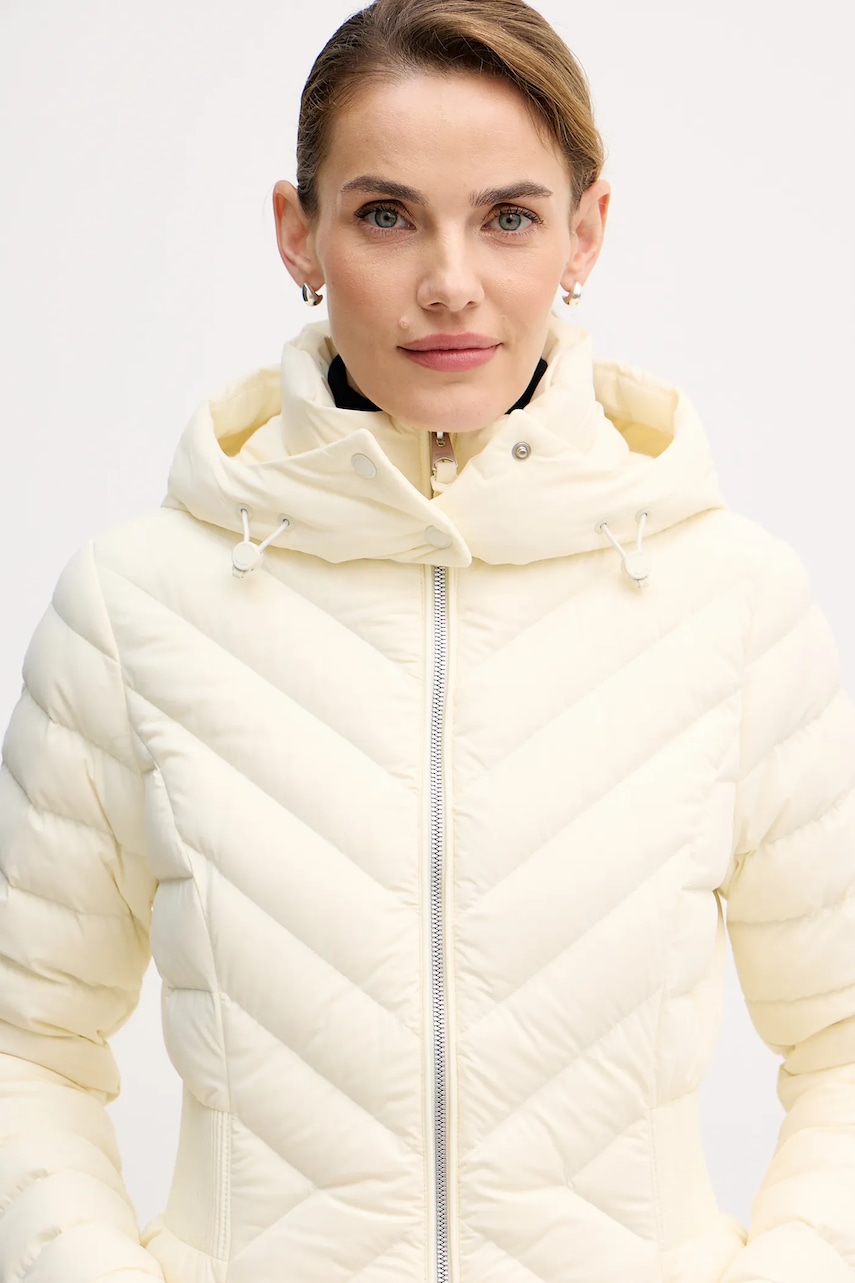 - Recycled Blended Claim Standard (RBCS) to standard certyfikacyjny, który dotyczy produktów zawierających materiały pochodzące z recyklingu. Zapewnia wiarygodność informacji o udziale recyklingowanych materiałów w danym produkcie. Standard ten weryfikuje pochodzenie materiałów z recyklingu oraz kontroluje łańcuch dostaw. - Model częściowo wykonany z materiału wyprodukowanego z przetworzonych butelek PET. - Wypełnienie z naturalnego puchu i pierza pochodzącego z recyklingu. - 2. stopień ocieplenia "The go-to" gwarantuje komfort termiczny w temperaturach od -5 do -10°C. - Dopasowany, podkreślający sylwetkę fason. - Podwyższony kołnierz gwarantuje dodatkową ochronę przed chłodem. - Odpinany kaptur, regulowany za pomocą troczków ze stoperami, zwiększa ochronę przed wiatrem i deszczem. - Zapięcie na całej długości na suwak wyposażony w wewnętrzną klapkę przeciwsztormową. - Rękawy wykończone elastyczną lamówką, dzięki której ubranie lepiej przylega do ciała i wygodnie się zakłada. - Dwie kieszenie boczne na ręce zapinane na zamek błyskawiczny. - Dodatkowa kieszeń wewnętrzna pozwala na bezpieczne przechowywanie drobiazgów. - Elastyczna wstawka zapewnia indywidualne dopasowanie. - Długość rękawa: 64 cm. - Długość: 67 cm. - Szerokość pod pachami: 48 cm. - Szerokość w ramionach: 40 cm. - Wymiary podane dla rozmiaru: S.