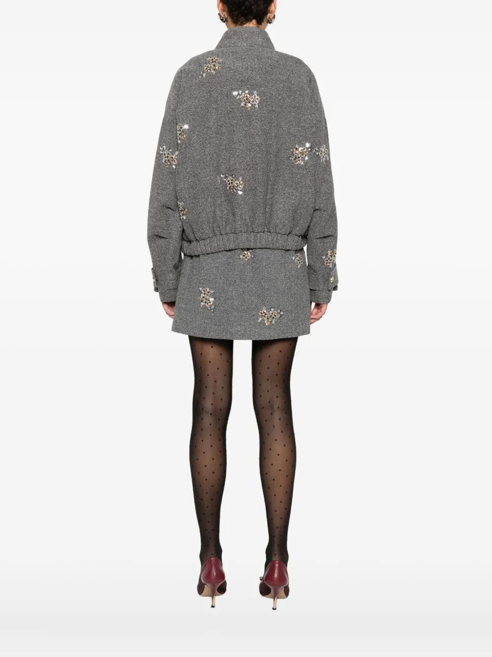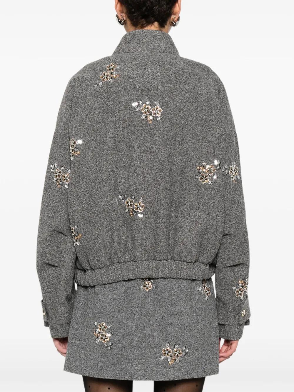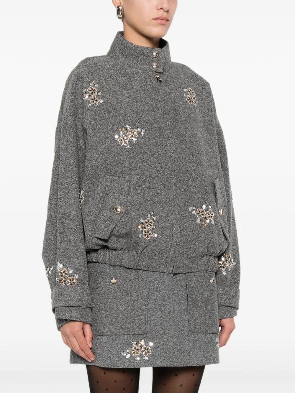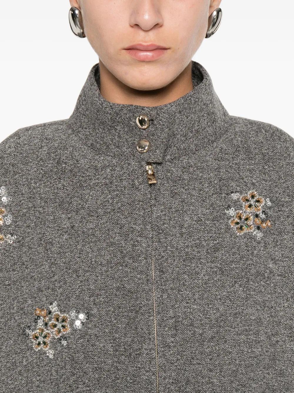grey sequin embellishment front zip fastening side flap pockets high neck buttoned cuffs