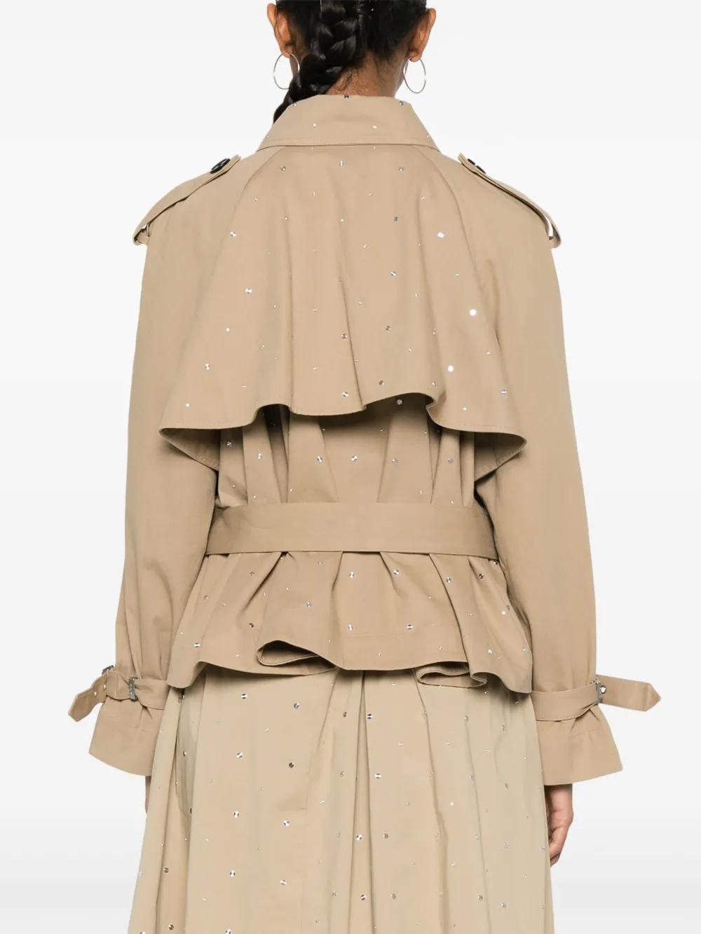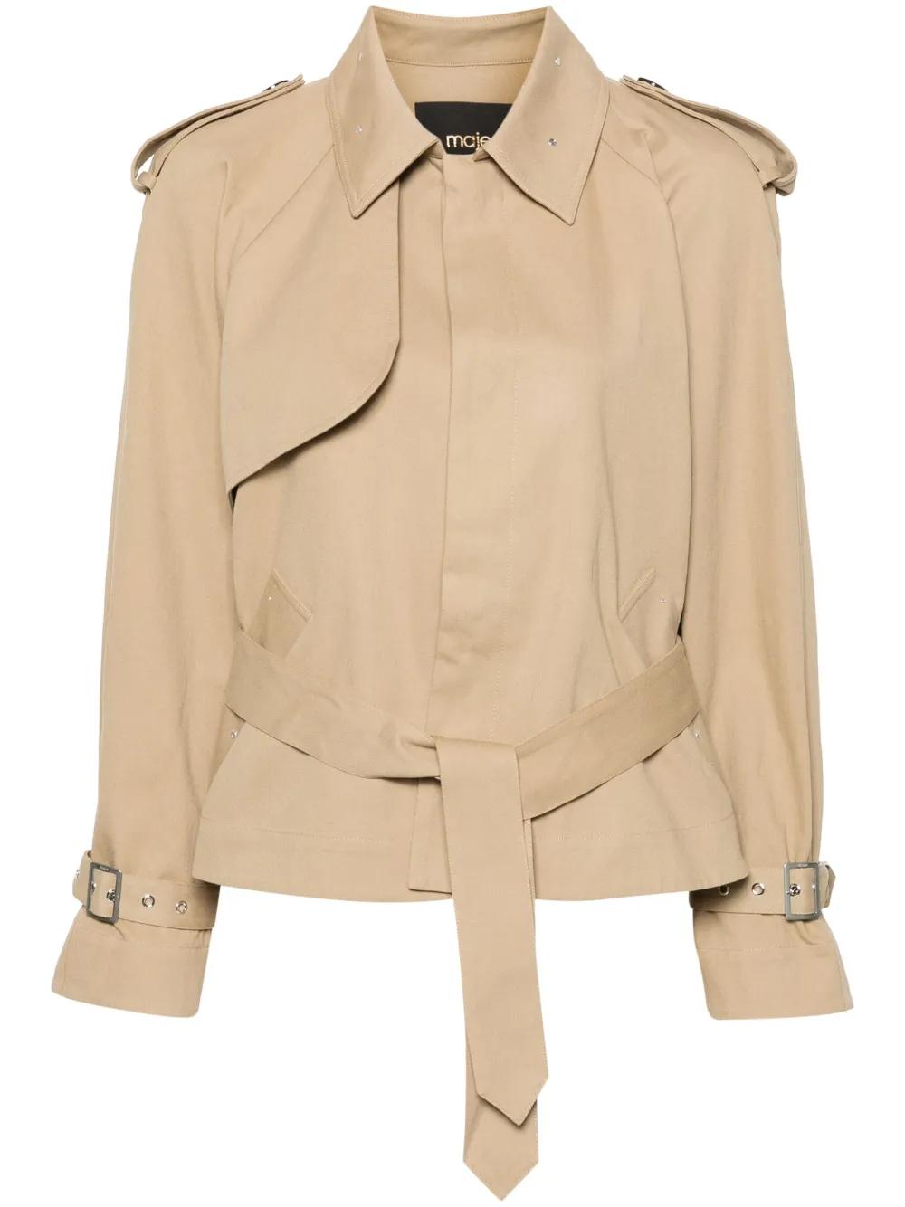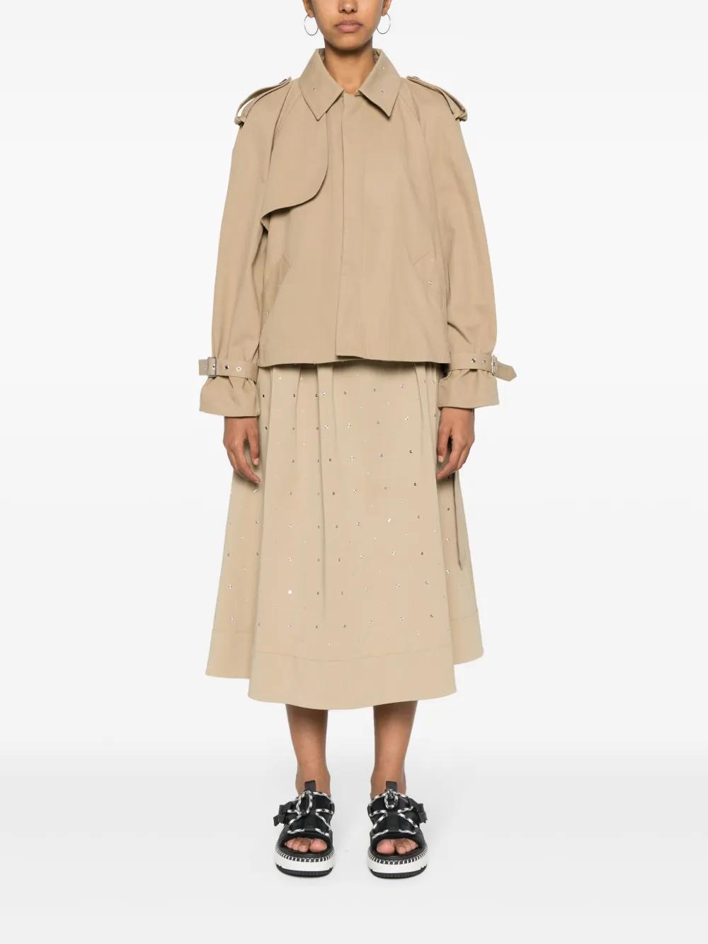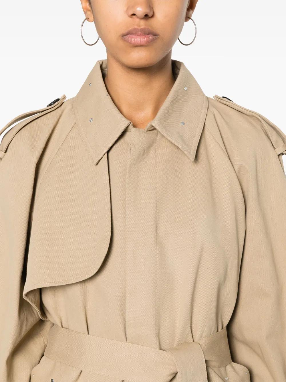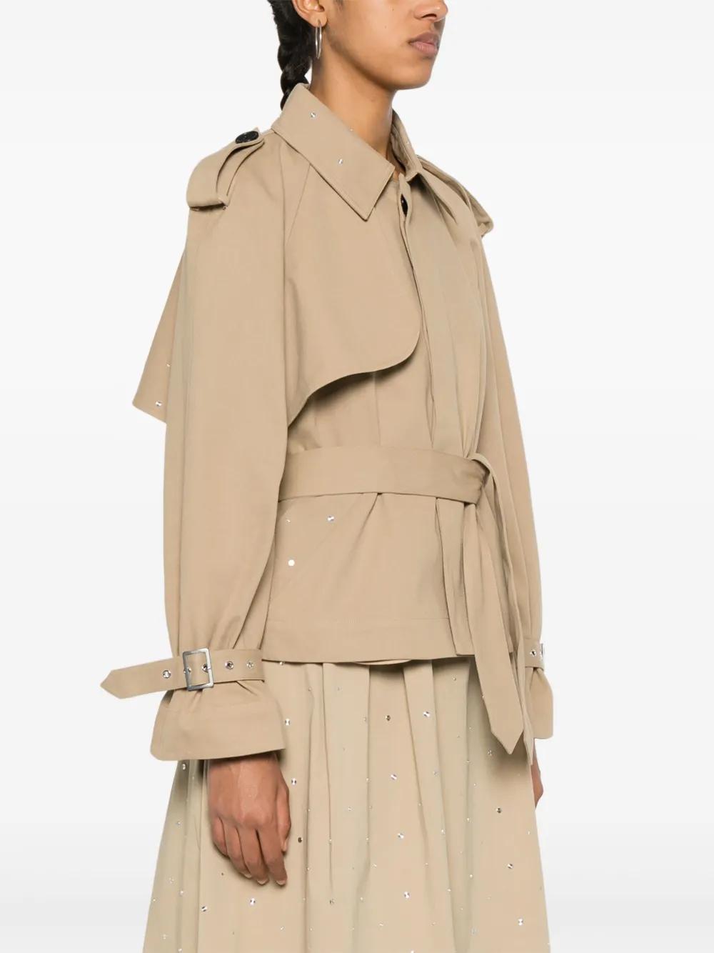 beige cotton gabardine weave silver-tone stud embellishment spread collar epaulettes long sleeves belted cuffs two side welt pockets storm flap straight hem unlined concealed front button fastening