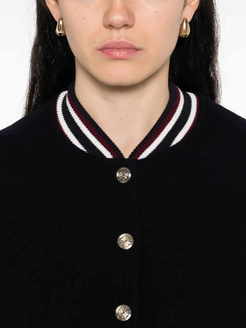 navy blue wool contrasting sleeves button fastening ribbed cuffs striped ribbed hem