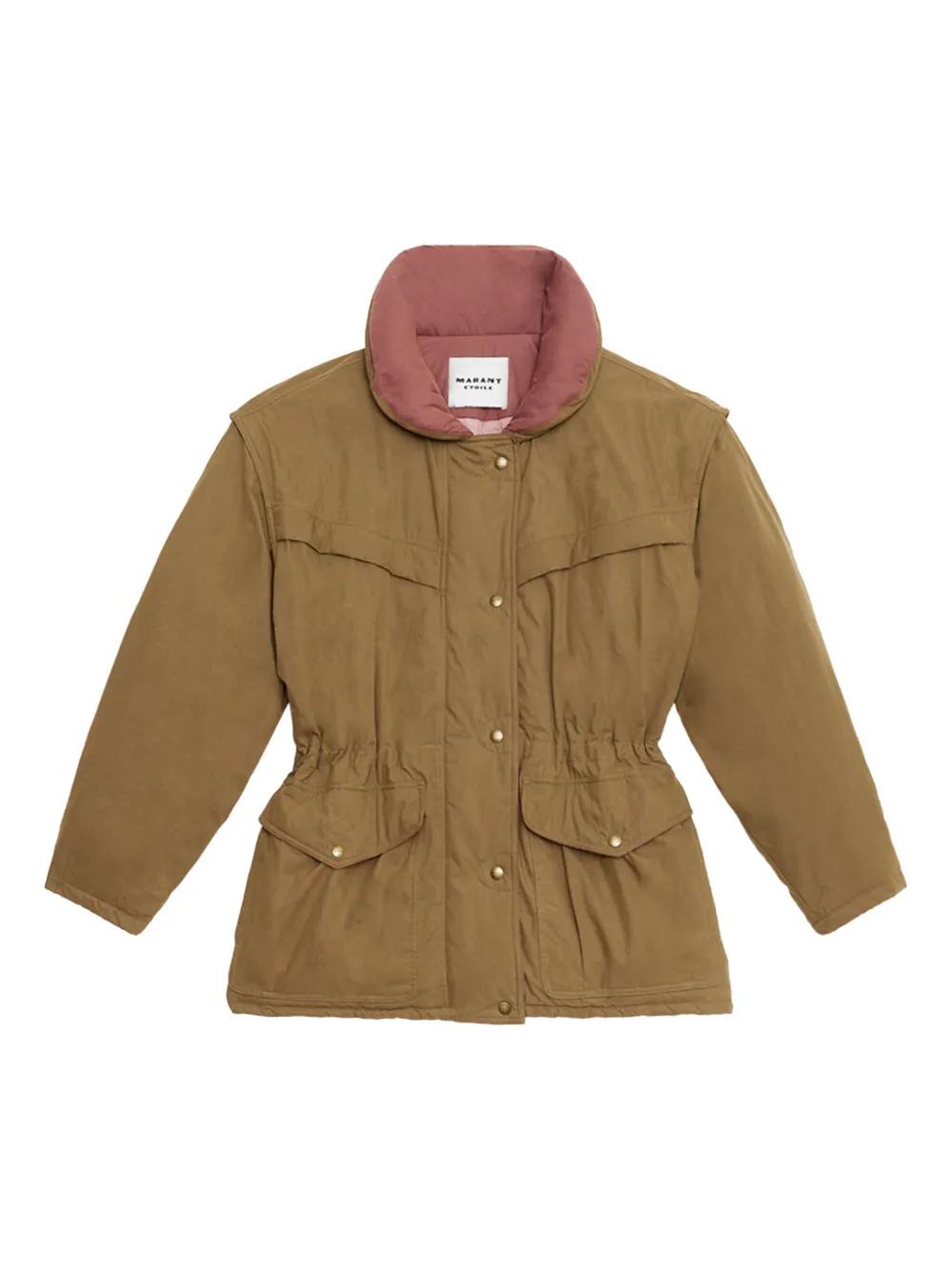 khaki front press-stud fastening two front flap pockets rounded collar long sleeves
