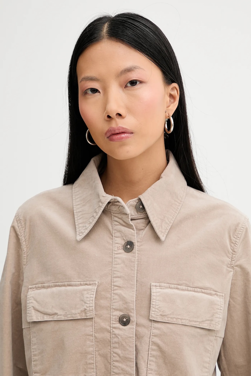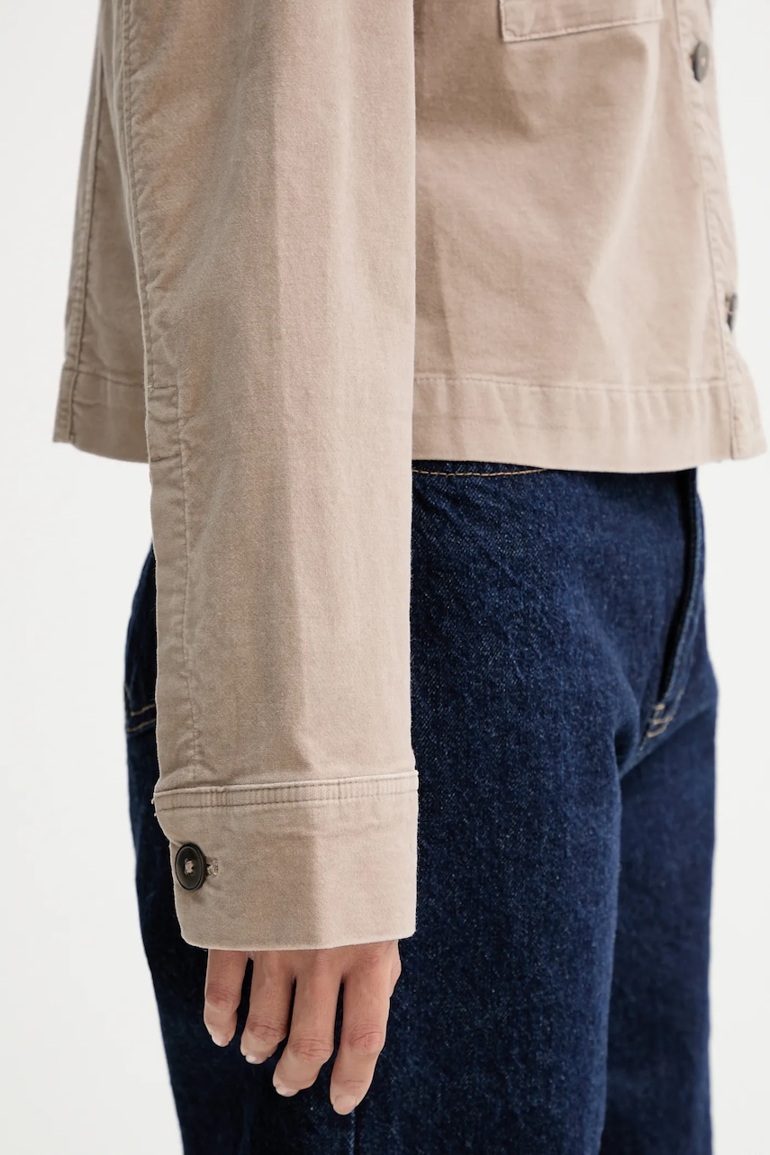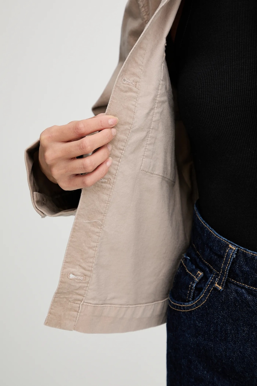 - Prosty fason. - Jednorzędowe zapięcie na guziki. - Kieszonki na piersi. - Model z kołnierzykiem. - Model wykonany z weluru. - Ten produkt został uszyty częściowo z certyfikowanej bawełny organicznej, która jest uprawiana i zbierana z roślin niezmodyfikowanych genetycznie, bez użycia nawozów i pestycydów. Proces produkcji bawełny organicznej jest bardziej przyjazny dla środowiska, a produkty z niej uszyte bardziej przyjazne dla Ciebie. Nasza bawełna posiada certyfikat OCS 100 (Organic Content Standard), który weryfikuje zawartość włókien organicznych w produkcie końcowym – dzięki temu możesz być pewien, że nasza bawełna jest organiczna. - Długość: 58 cm. - Długość rękawa: 60 cm. - Szerokość pod pachami: 51 cm. - Wymiary podane dla rozmiaru: 36.