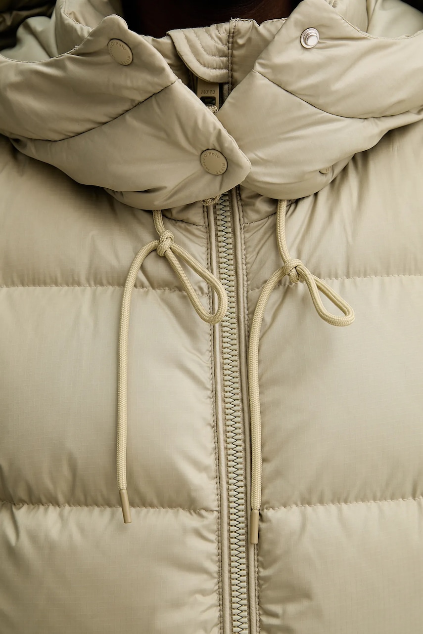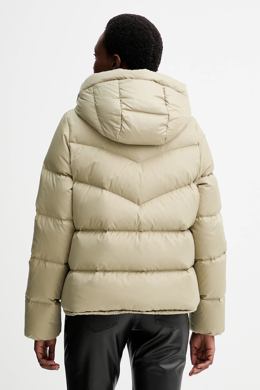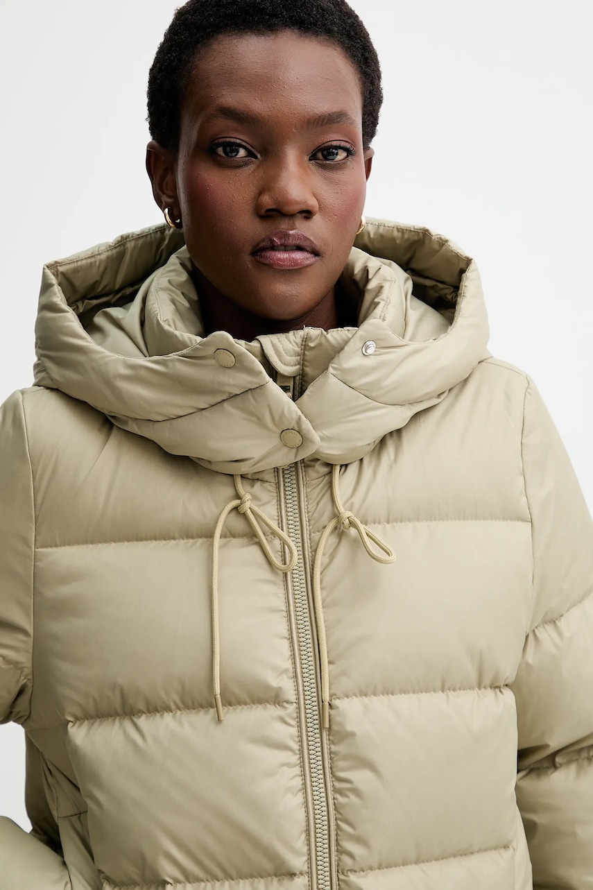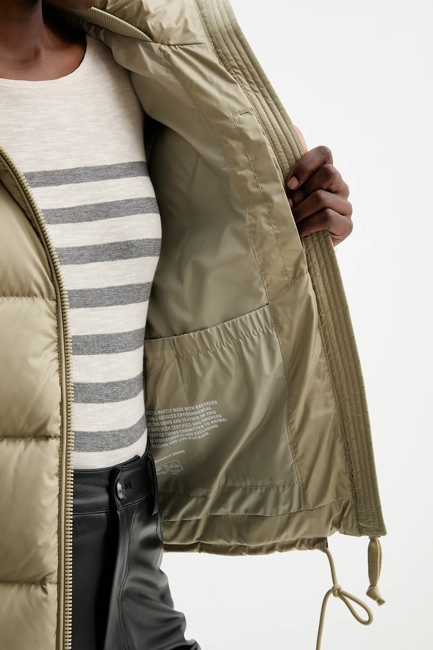 - Responsible Wool Standard (RWS). Program, gwarantujący, że przystępujący do niego dobrowolnie hodowcy owiec spełniają rygorystyczne wymagania w zakresie dobrostanu zwierząt i zrównoważonego gospodarowania gruntami. - Produkt zawiera materiały z włókien pochodzących z recyklingu. - Ocieplony model na podszewce. - Prosty, nie blokujący ruchów fason. - Zapięcie na dwustronny suwak. - Podwyższony kołnierz gwarantuje dodatkową ochronę przed chłodem. - Odpinany kaptur z troczkami. - Rękawy wykończone ściągaczem. - Dolna krawędź wykończona troczkami, które zapewniają indywidualne dopasowanie. - Dwie wsuwane i zapinane na zatrzask kieszenie boczne. - Wsuwana kieszeń wewnętrzna. - Wypełnienie z naturalnego puchu i pierza. - Długość rękawa: 64 cm. - Długość: 59 cm. - Szerokość pod pachami: 55 cm. - Szerokość w ramionach: 39 cm. - Wymiary podane dla rozmiaru: S.