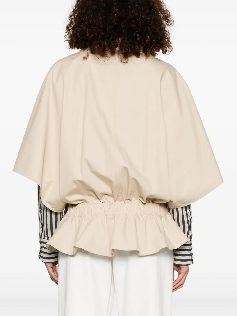 light beige front zip fastening two side welt pockets high neck wide sleeves