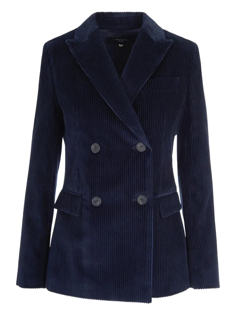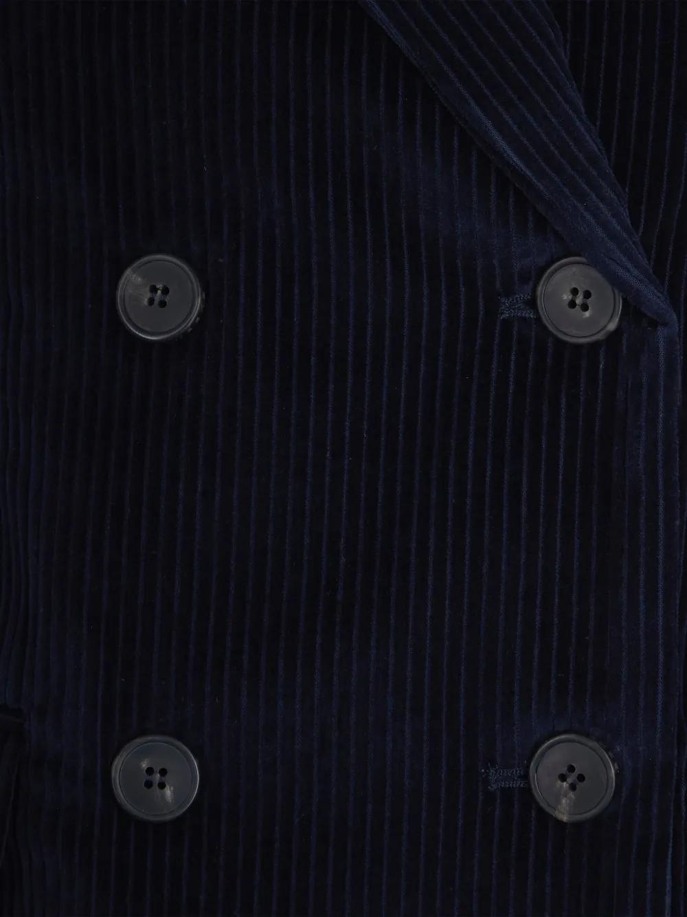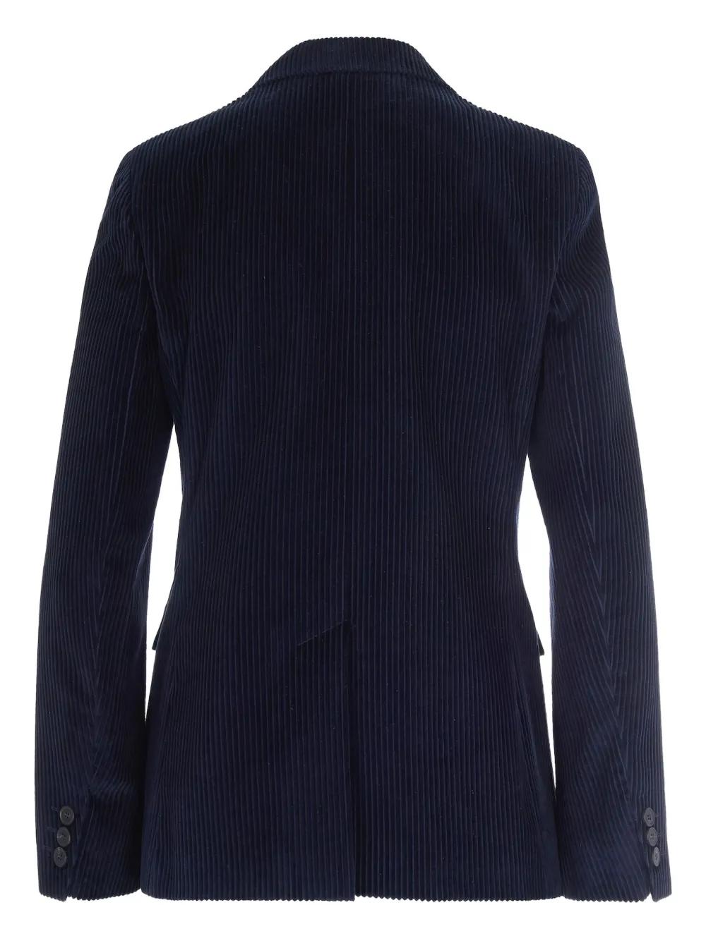 navy blue corduroy texture button fastening notched lapels front flap pockets long sleeves
