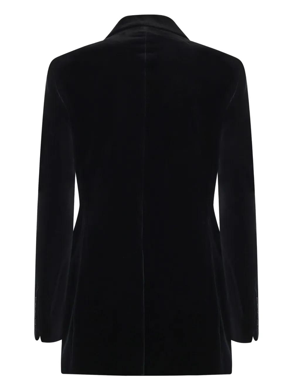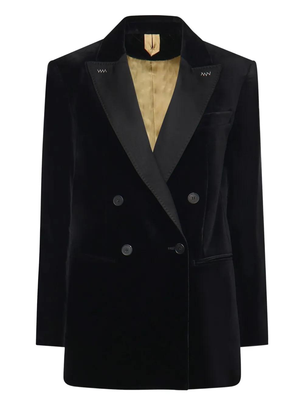 black double-breasted peaked lapels button fastening chest welt pocket long sleeves