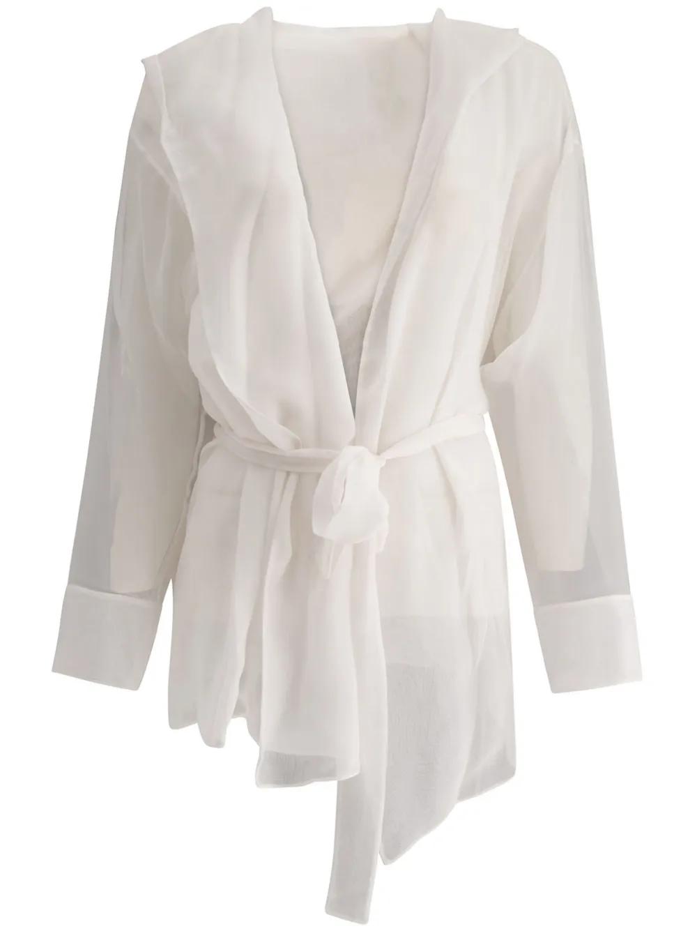 ivory white silk chiffon layered effect shawl collar classic hood open front tied waist long sleeves asymmetric hem