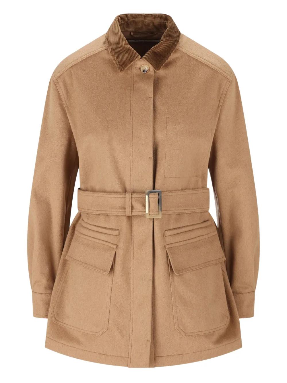 brown corduroy collar button fastening belt front flap pockets camel wool