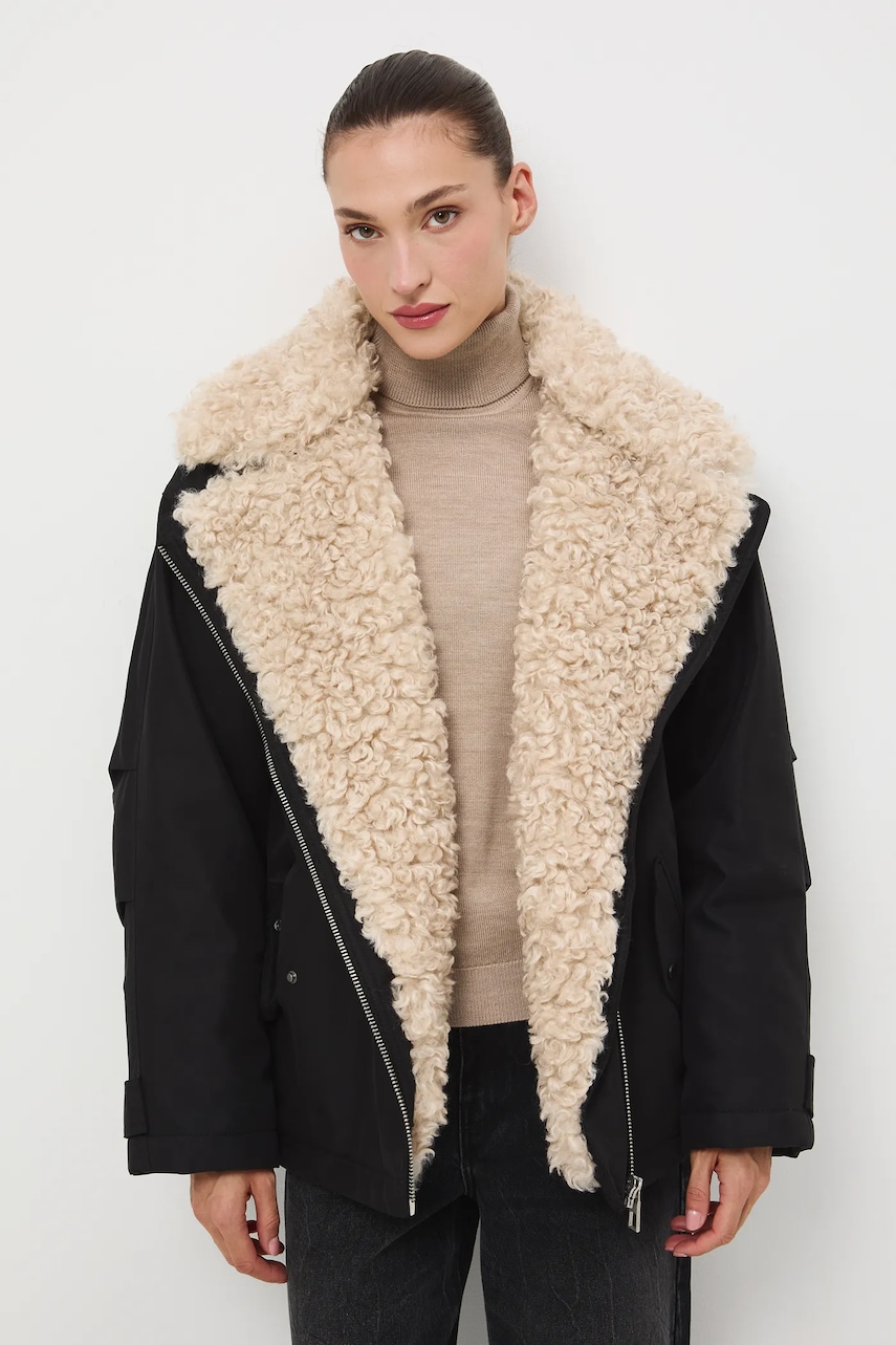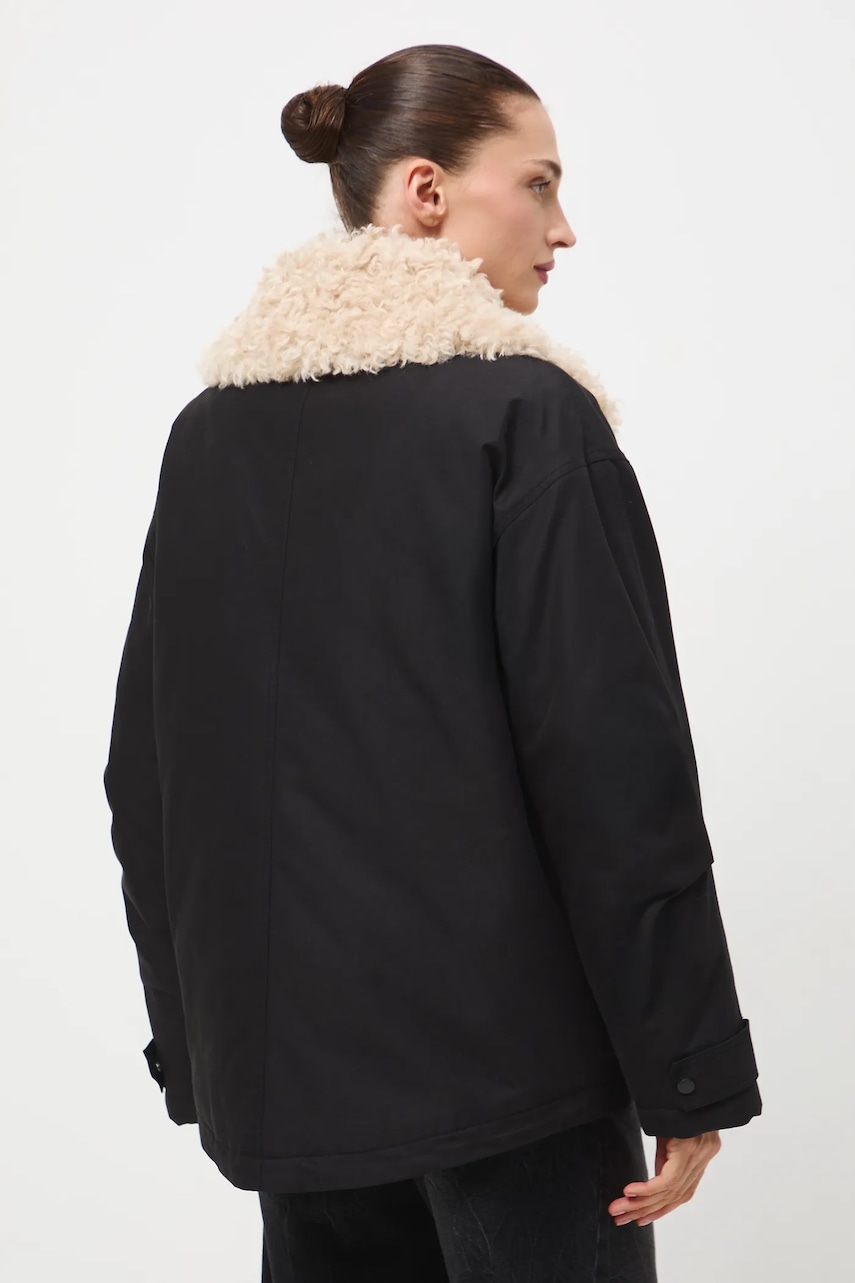 - Fason oversize. - Długi rękaw. - Obniżona linia ramion. - Mankiety zapinane na zatrzaski. - Zapięcie na suwak. - Kieszenie z patkami zapinane na zatrzask. - Miękkie i przyjemne w dotyku sztuczne futerko. - Ocieplony model na podszewce. - Pikowana podszewka. - Gładki materiał. - Długość rękawa(mierzona od kołnierza): 77 cm. - Długość: 71 cm. - Szerokość w biuście: 61 cm. - Wymiary podane dla rozmiaru: S.
