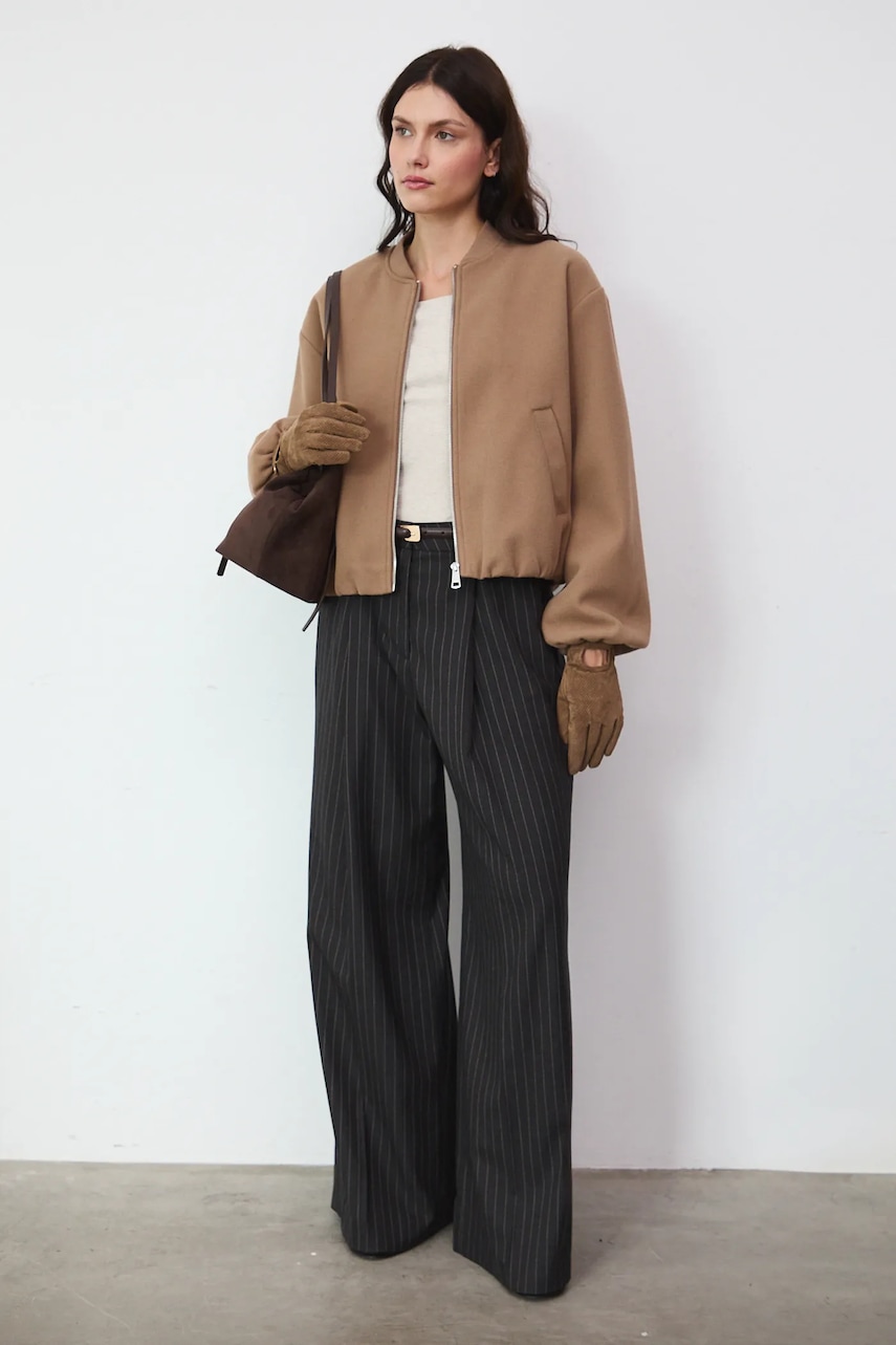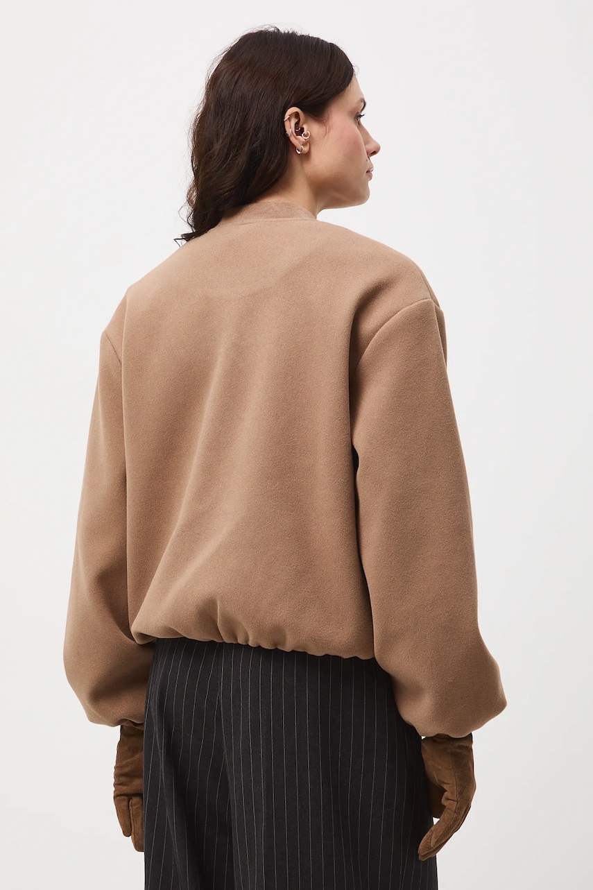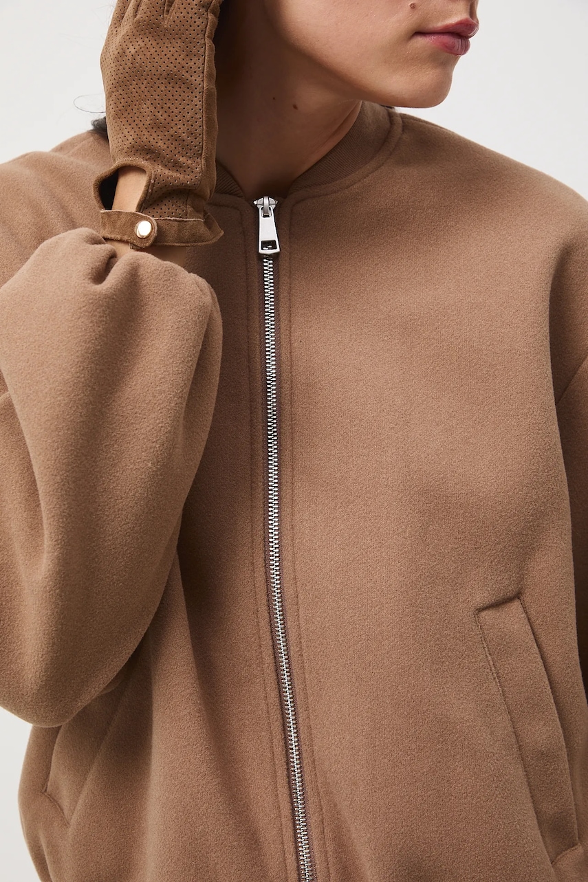 - Fason oversize. - Długi rękaw. - Obniżona linia ramion. - Kołnierz typu bomber. - Zapięcie na suwak. - Wsuwane kieszenie. - Rękawy i dolna krawędź wykończone elastyczną gumką. - Nieocieplony model na podszewce. - Gładka tkanina. - Długość rękawa(mierzona od kołnierza): 76,5 cm. - Długość: 58 cm. - Szerokość w biuście: 58 cm. - Wymiary podane dla rozmiaru: S.