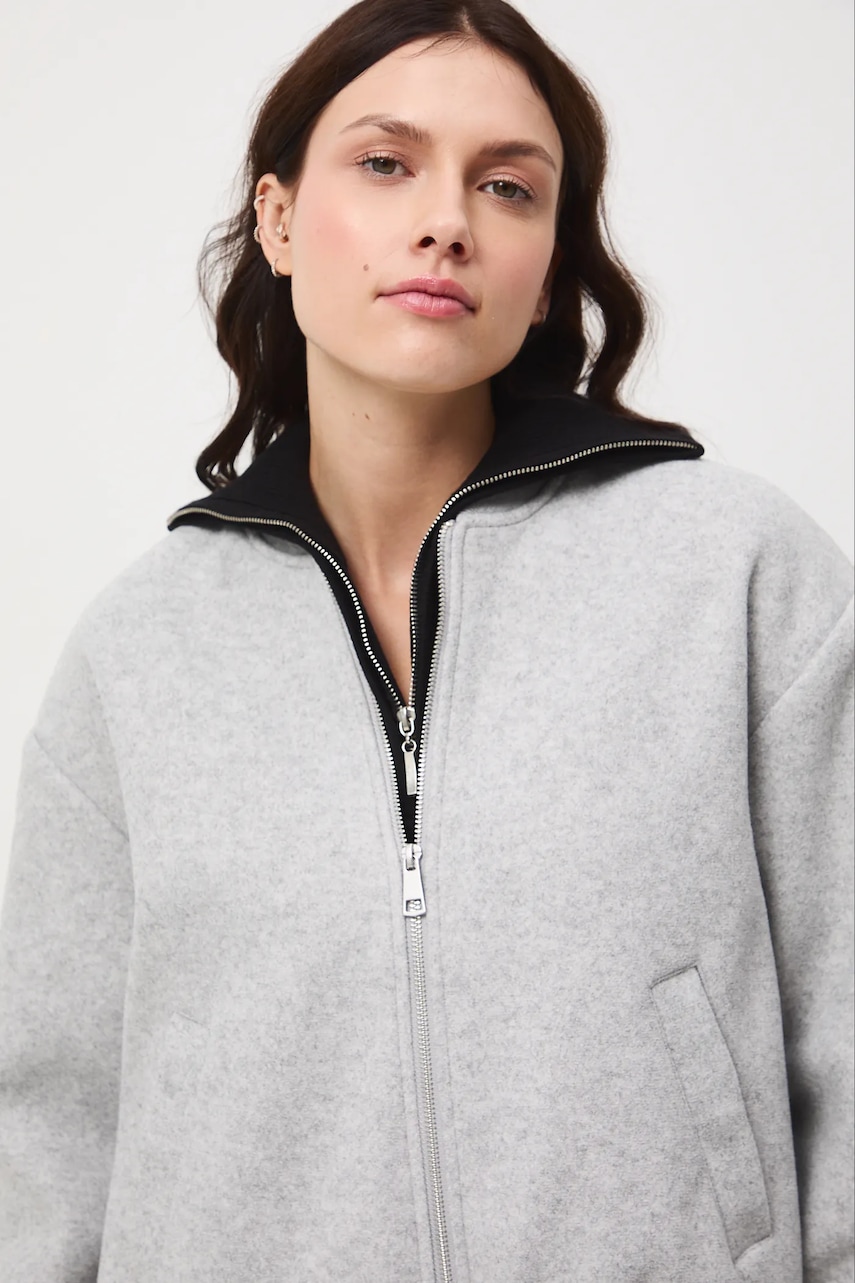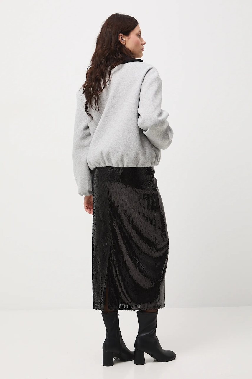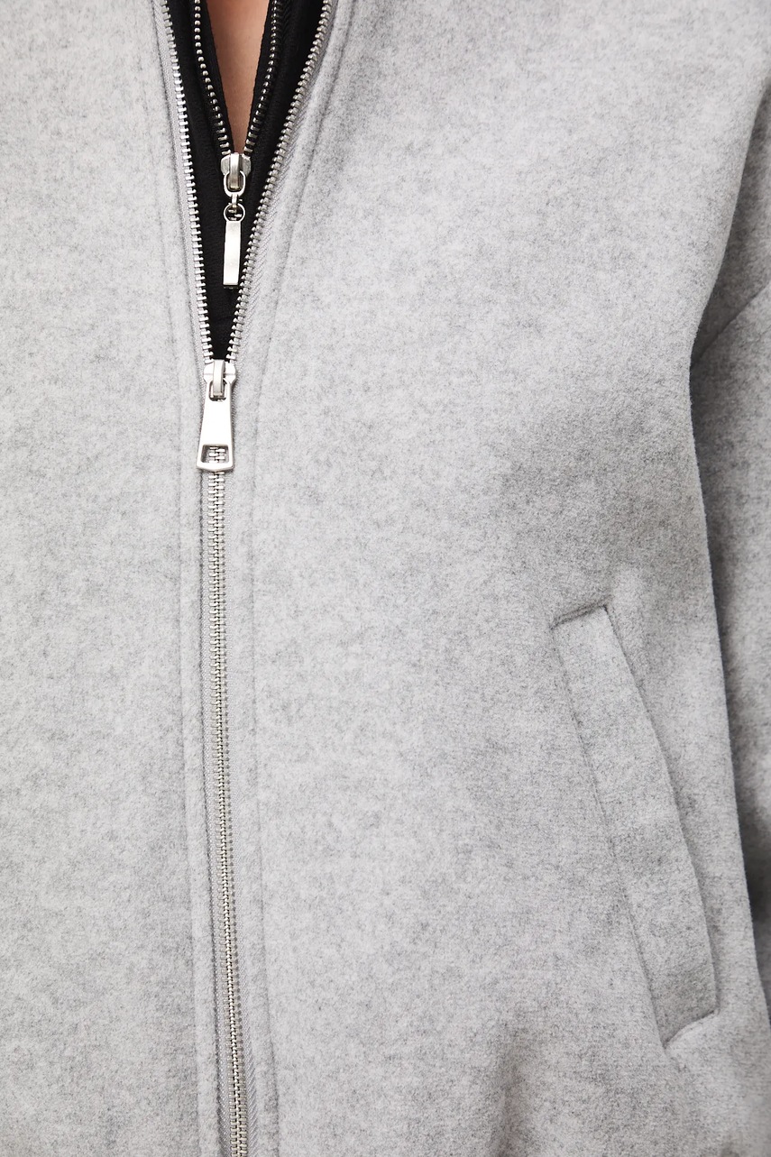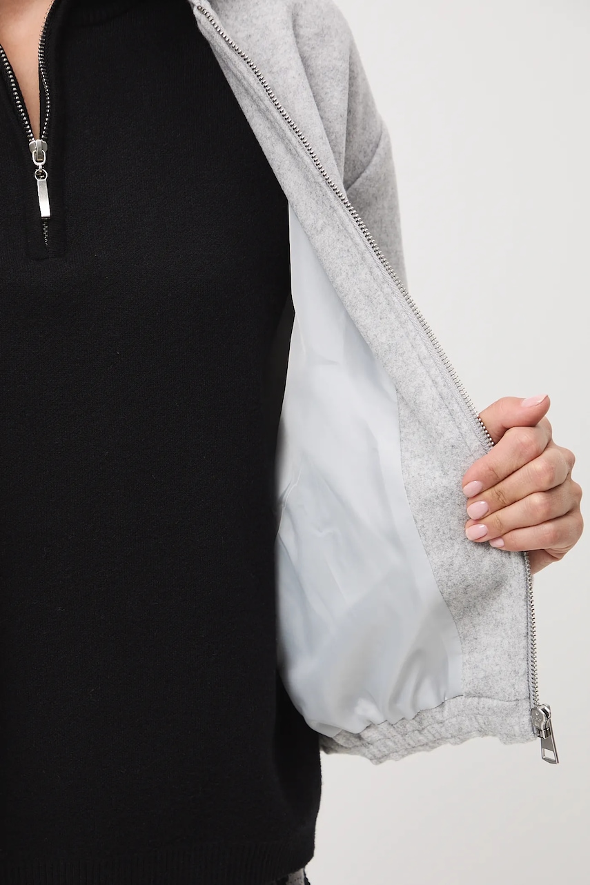 - Fason oversize. - Długi rękaw. - Obniżona linia ramion. - Kołnierz typu bomber. - Zapięcie na suwak. - Wsuwane kieszenie. - Rękawy i dolna krawędź wykończone elastyczną gumką. - Nieocieplony model na podszewce. - Melanżowa tkanina. - Długość rękawa(mierzona od kołnierza): 76,5 cm. - Długość: 58 cm. - Szerokość w biuście: 58 cm. - Wymiary podane dla rozmiaru: S.