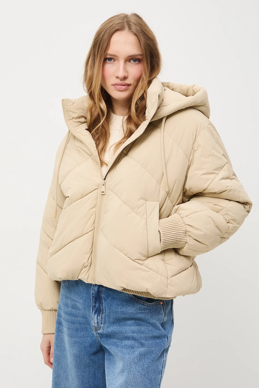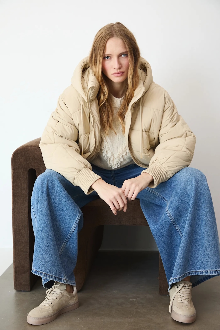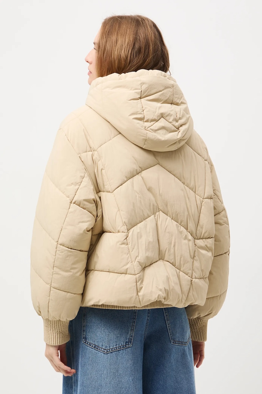 - Fason oversize. - Podwyższony kołnierz. - Zapięcie na suwak. - Kaptur ściągany troczkami. - Wykończenie ze ściągacza. - Dwie wsuwane kieszenie boczne. - Ocieplony model na podszewce. - Pikowany model. - Długość rękawa: 61 cm. - Długość: 63 cm. - Szerokość w biuście: 76 cm. - Szerokość w barkach: 54 cm. - Wymiary podane dla rozmiaru: S.