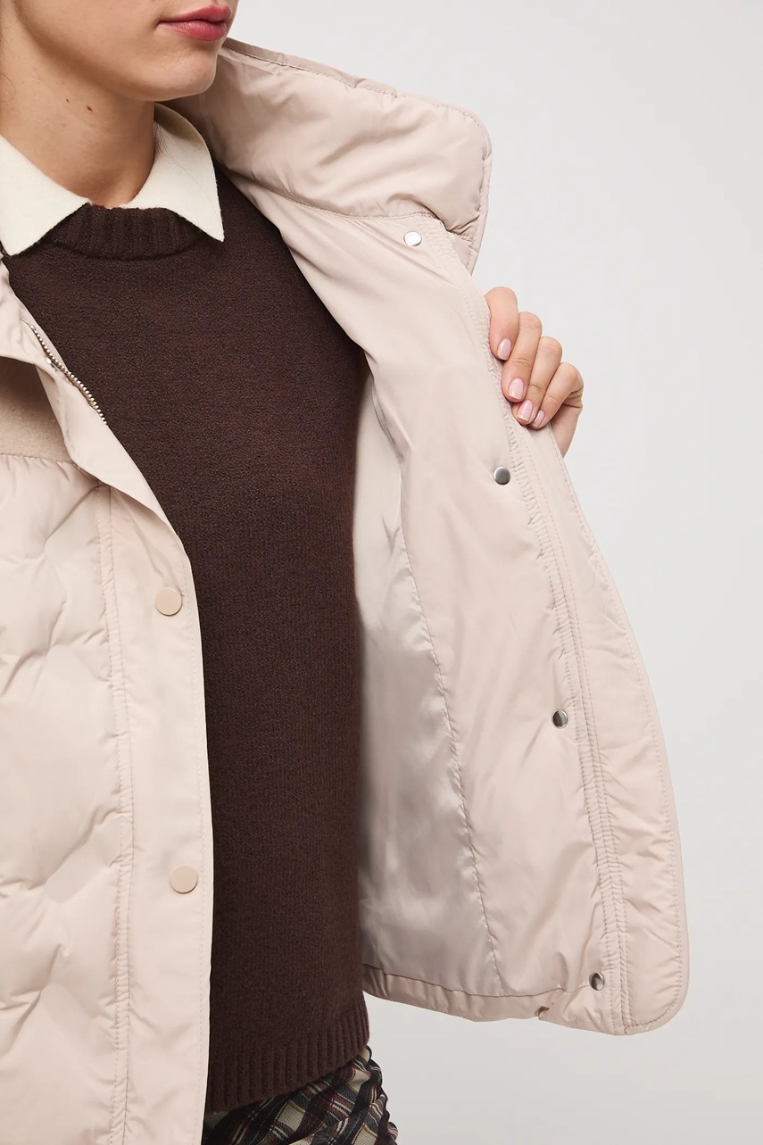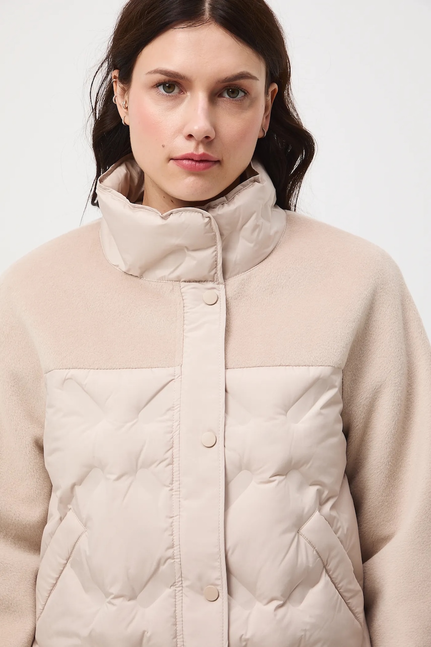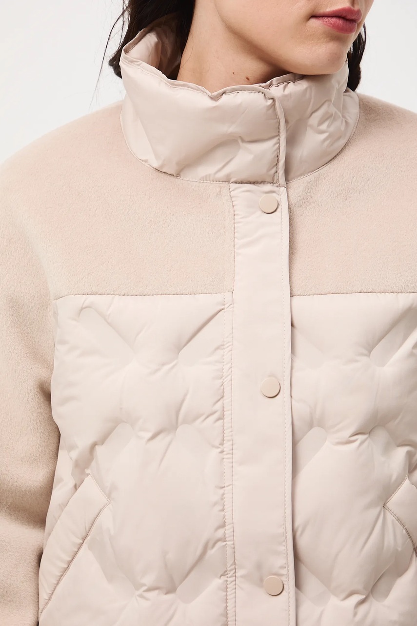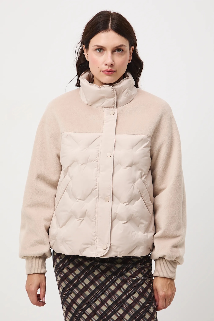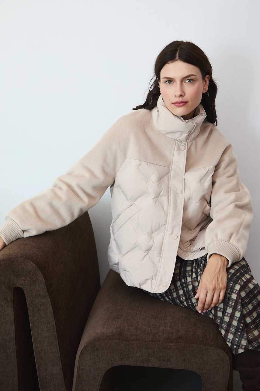 - Fason regular. - Długi, raglanowy rękaw. - Rękawy wykończone ściągaczem. - Podwyższony kołnierz. - Zapięcie na suwak i zatrzaski. - Dwie wsuwane kieszenie boczne. - Lekko ocieplony model na podszewce. - Model wykonany z połączenia pikowanego materiału i imitacji futra. - Długość rękawa(mierzona od kołnierza): 77 cm. - Długość: 62 cm. - Szerokość w biuście: 56 cm. - Wymiary podane dla rozmiaru: S.