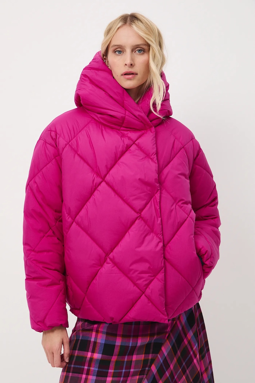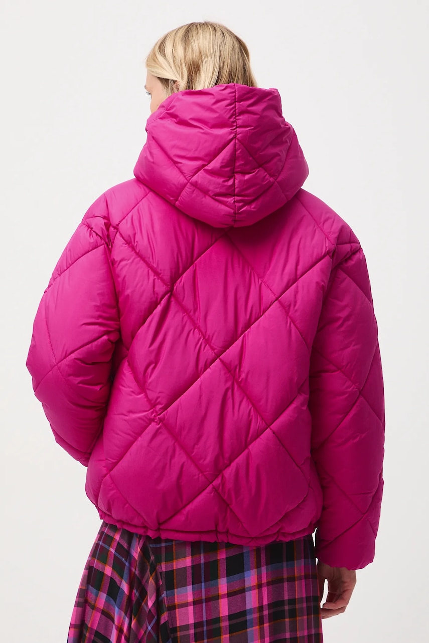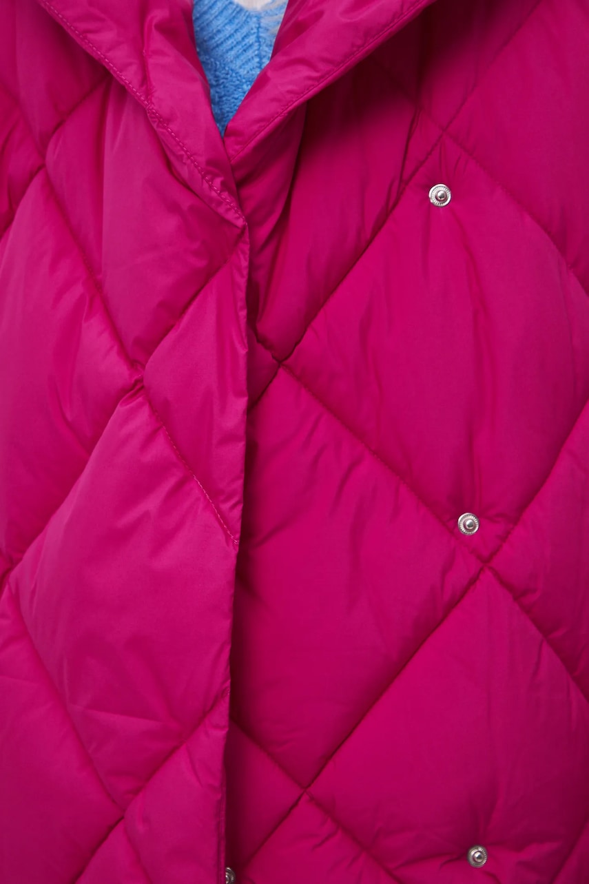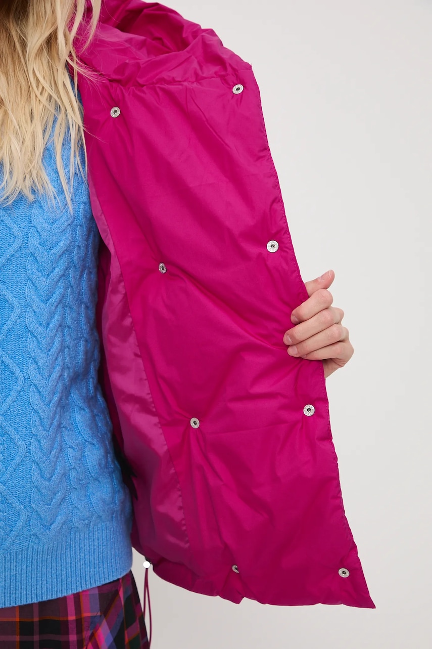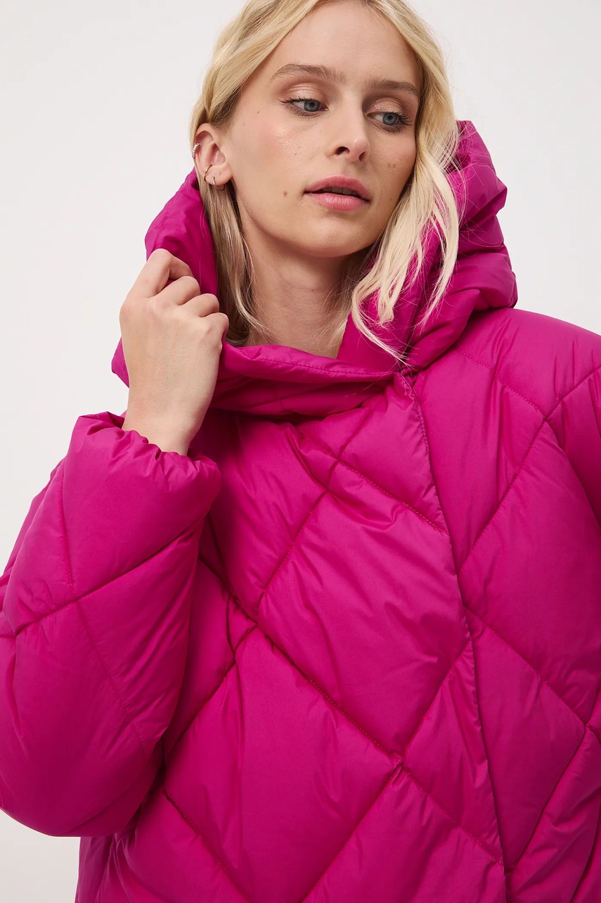 - Fason oversize. - Model z kapturem. - Dwurzędowe zapięcie na zatrzaski. - Dolna krawędź wykończona troczkami ze stoperami. - Dwie wsuwane i zapinane na suwak kieszenie boczne. - Lekko ocieplony model na podszewce. - Pikowany model. - Długość rękawa: 58 cm. - Długość: 67 cm. - Szerokość w biuście: 60 cm. - Szerokość w barkach: 54,5 cm. - Wymiary podane dla rozmiaru: S.