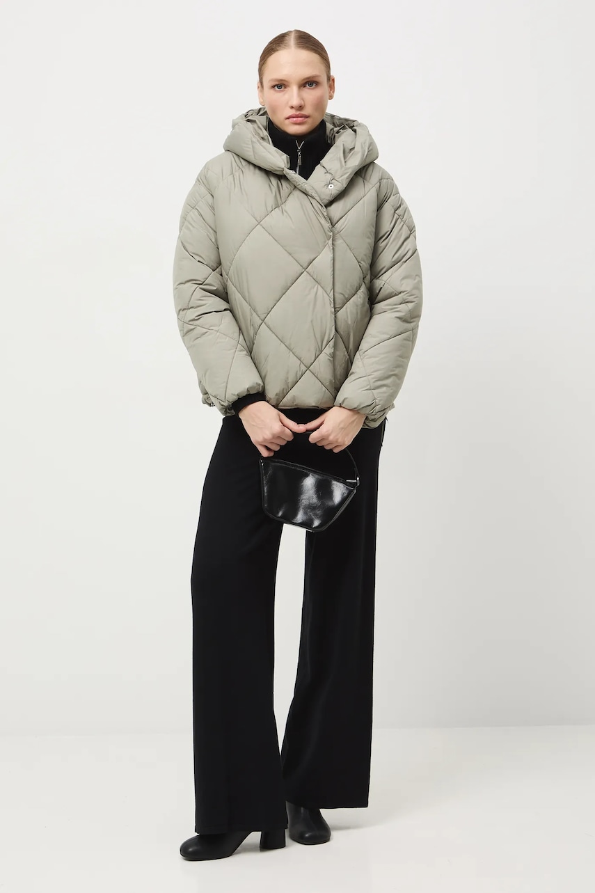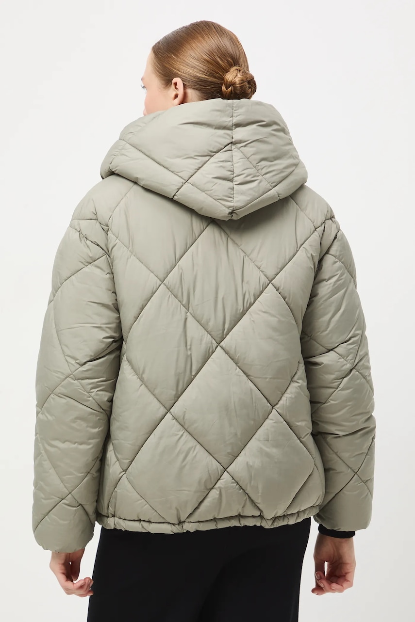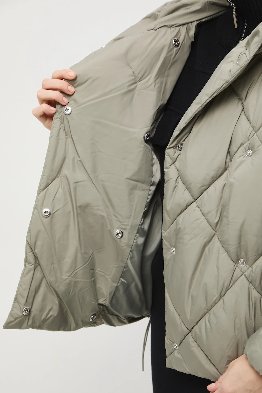 - Fason oversize. - Model z kapturem. - Dwurzędowe zapięcie na zatrzaski. - Dolna krawędź wykończona troczkami ze stoperami. - Dwie wsuwane i zapinane na suwak kieszenie boczne. - Lekko ocieplony model na podszewce. - Pikowany model. - Długość rękawa: 58 cm. - Długość: 67 cm. - Szerokość w biuście: 60 cm. - Szerokość w barkach: 54,5 cm. - Wymiary podane dla rozmiaru: S.