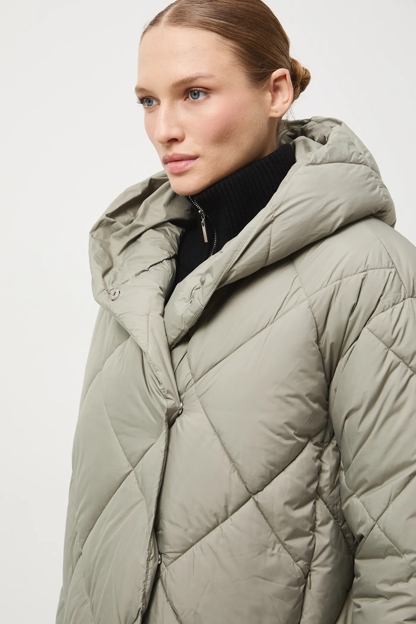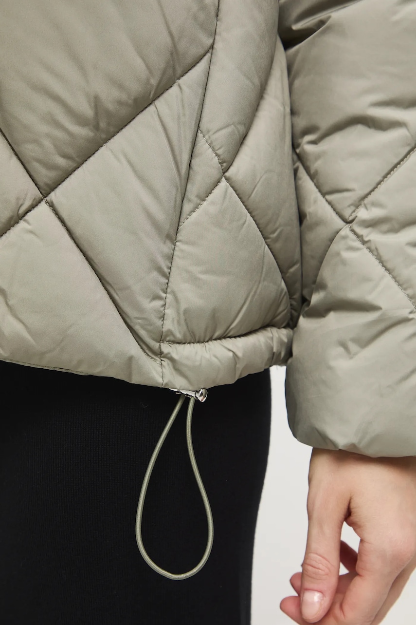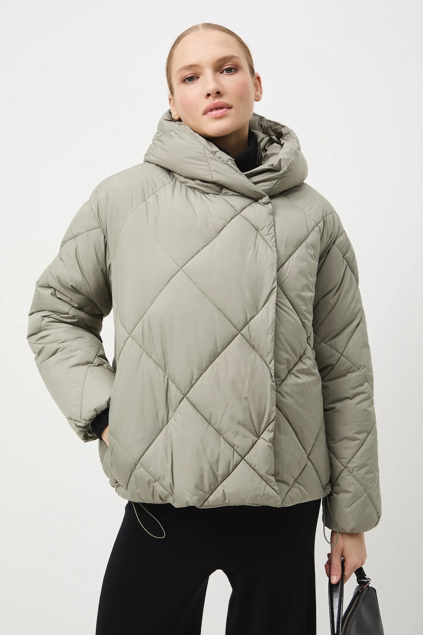 - Fason oversize. - Model z kapturem. - Dwurzędowe zapięcie na zatrzaski. - Dolna krawędź wykończona troczkami ze stoperami. - Dwie wsuwane i zapinane na suwak kieszenie boczne. - Lekko ocieplony model na podszewce. - Pikowany model. - Długość rękawa: 58 cm. - Długość: 67 cm. - Szerokość w biuście: 60 cm. - Szerokość w barkach: 54,5 cm. - Wymiary podane dla rozmiaru: S.