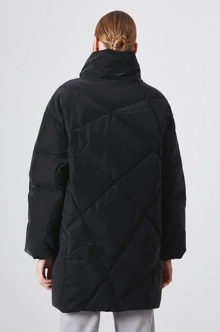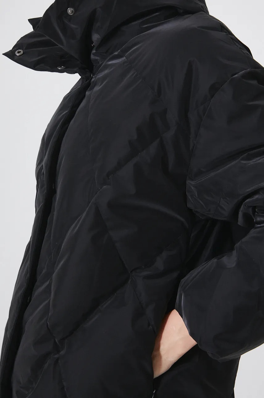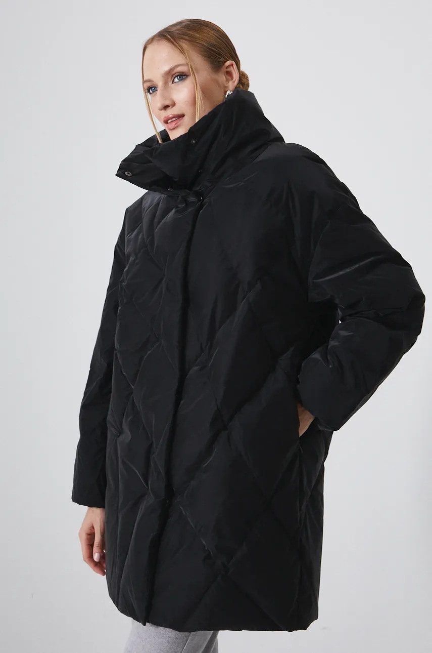- Fason oversize. - Obniżona linia ramion. - Podwyższony kołnierz. - Zapięcie na suwak i zatrzaski. - Dwie wsuwane i zapinane na suwak kieszenie boczne. - Ocieplony model na podszewce. - Wypełnienie z naturalnego puchu i pierza. - Pikowany model. - Długość rękawa(mierzona od kołnierza): 72 cm. - Długość: 90 cm. - Szerokość w biuście: 61,5 cm. - Wymiary podane dla rozmiaru: S.