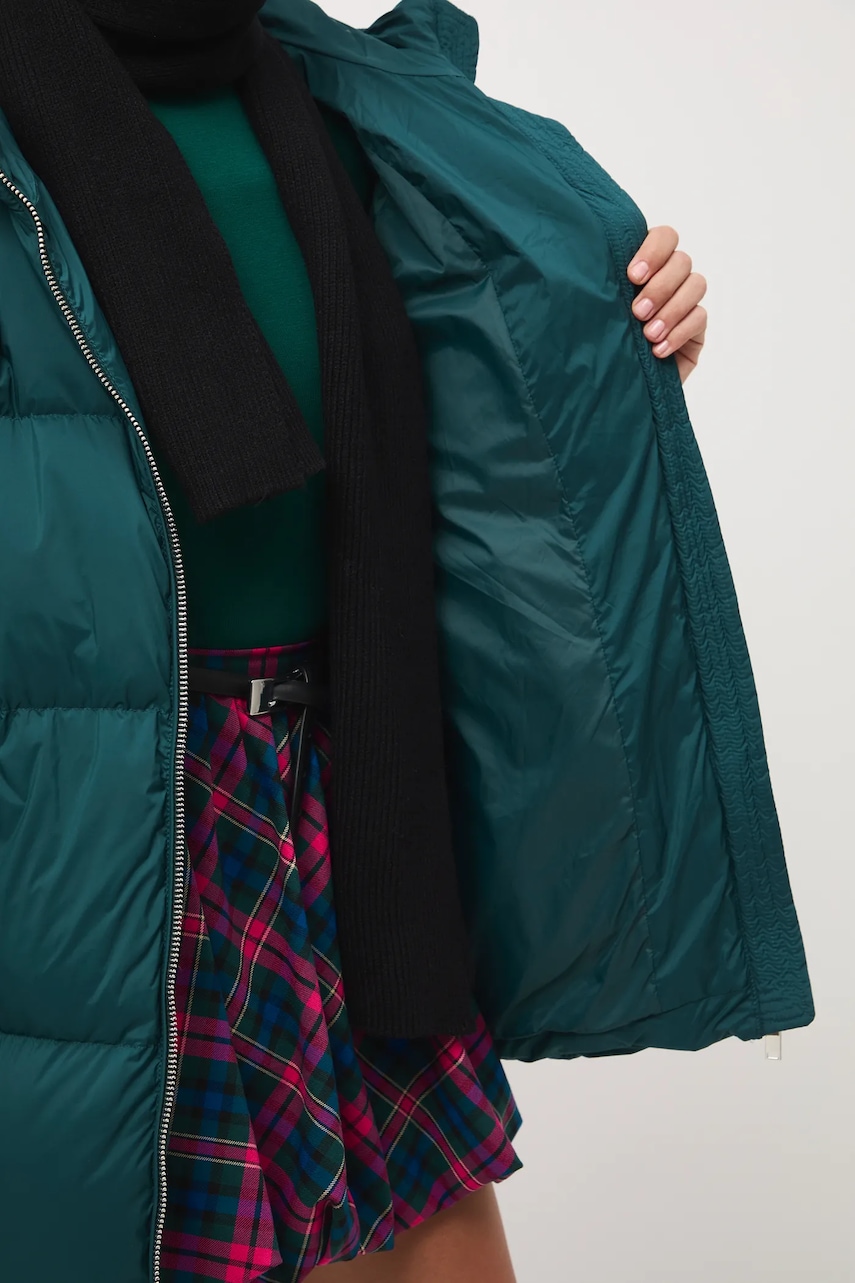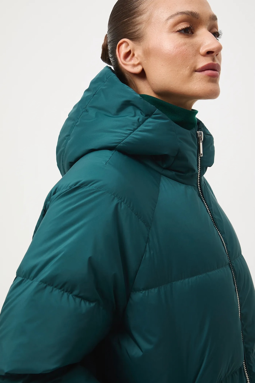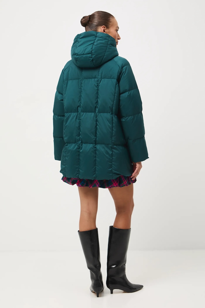 - Fason oversize. - Zapięcie na suwak. - Podwyższony kołnierz. - Model z kapturem. - Dwie wsuwane kieszenie boczne. - Ocieplony model na podszewce. - Pikowany model. - Wypełnienie z naturalnego puchu i pierza. - Długość rękawa(mierzona od kaptura): 75 cm. - Długość: 78 cm. - Szerokość w biuście: 68 cm. - Wymiary podane dla rozmiaru: S.