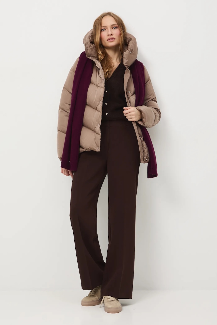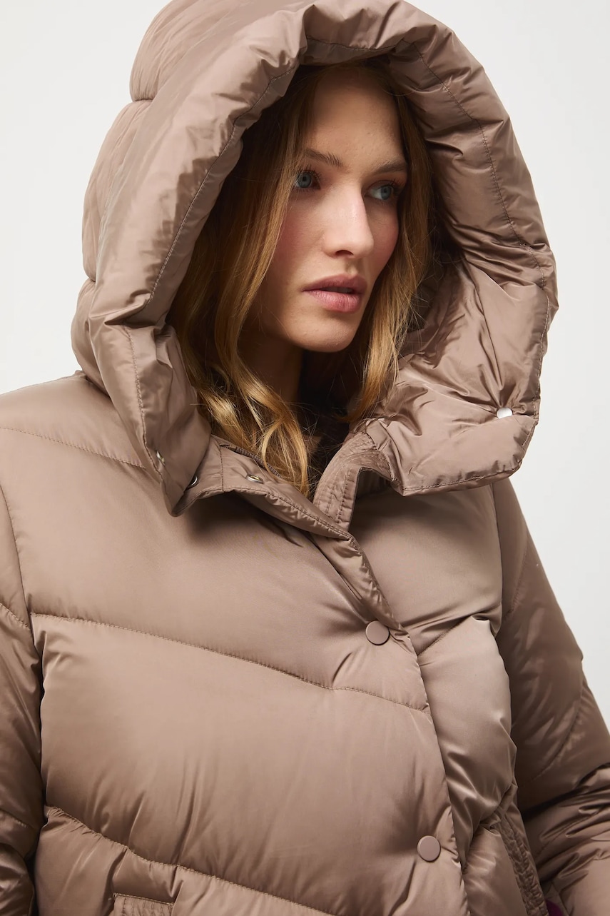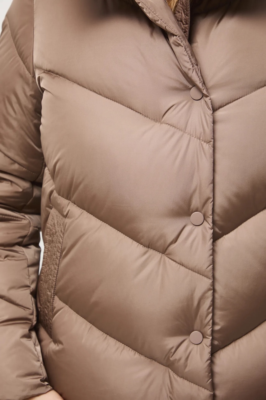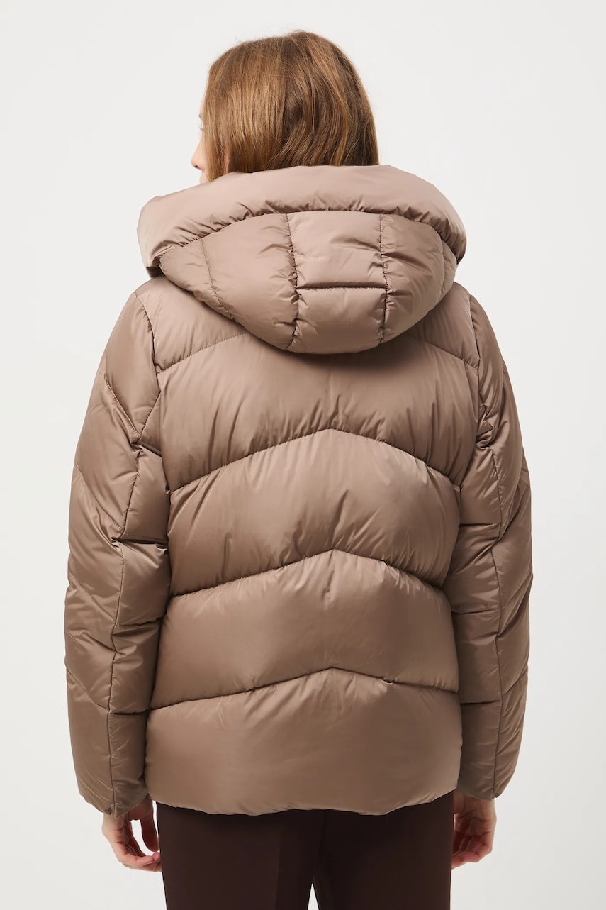 - Fason oversize. - Zapięcie na suwak i zatrzaski. - Podwyższony kołnierz. - Model z kapturem. - Dwie wsuwane kieszenie boczne. - Ocieplony model na podszewce. - Pikowany model. - Wypełnienie z naturalnego puchu i pierza. - Długość rękawa: 66 cm. - Długość: 70 cm. - Szerokość w biuście: 61 cm. - Szerokość w barkach: 43,5 cm. - Wymiary podane dla rozmiaru: S.