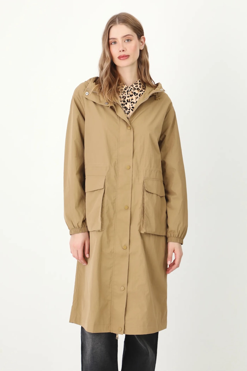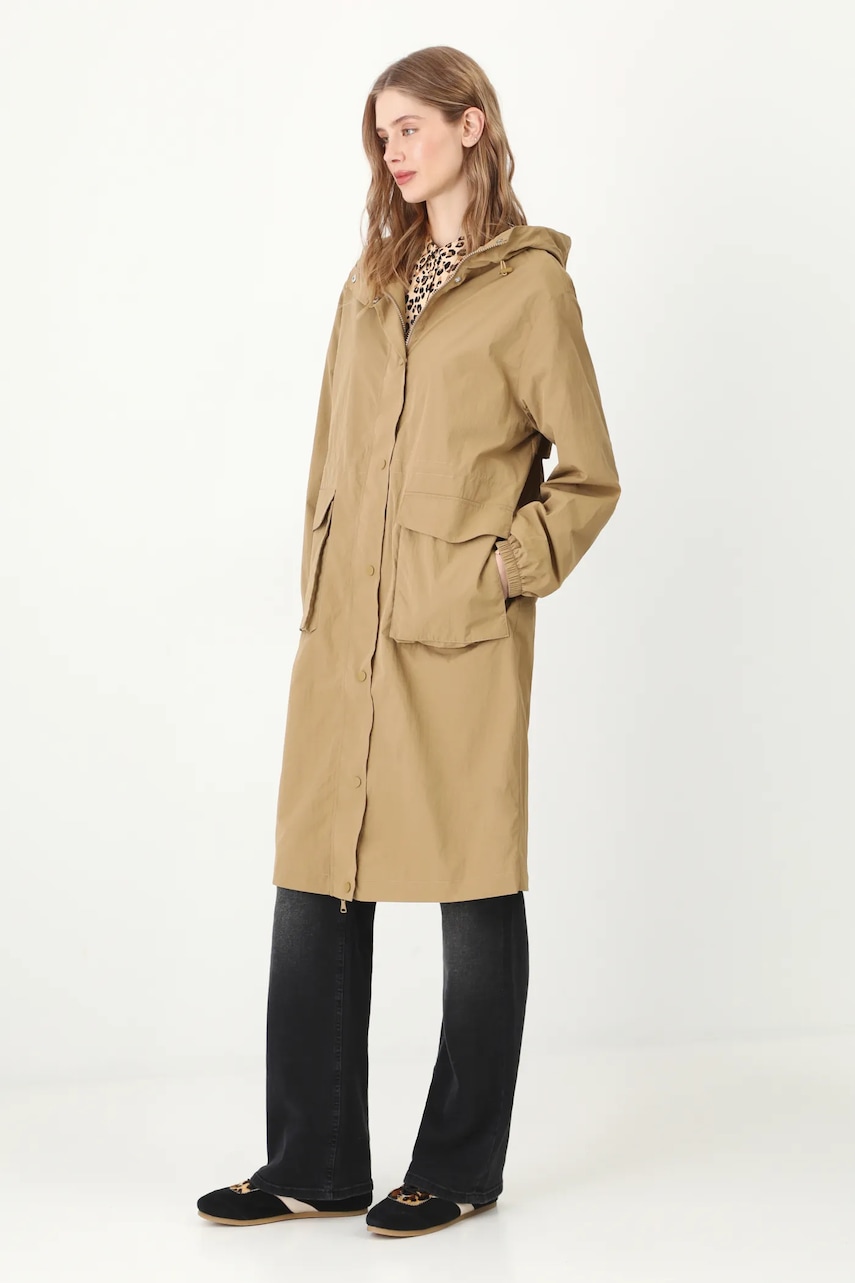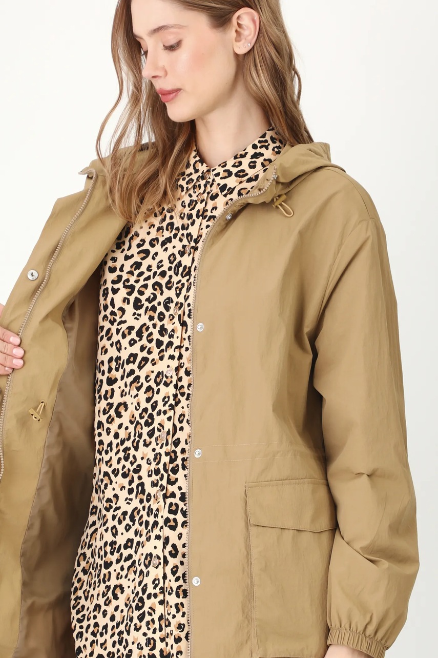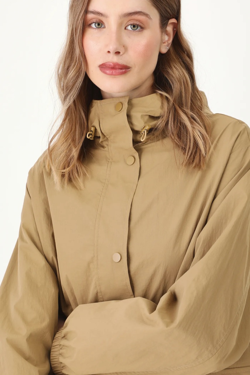 - Fason oversize. - Zapięcie na suwak i zatrzaski. - Długi rękaw. - Rękawy wykończone ściągaczem. - Podwyższony kołnierz. - Kaptur ściągany troczkami ze stoperami. - Wsuwane kieszenie zewnętrzne. - Model z kieszeniami ozdobionymi patkami. - W pasie wewnętrzna regulacja szerokości za pomocą troczków. - Nieocieplony model na podszewce. - Gładki materiał. - Długość rękawa: 59 cm. - Długość: 108 cm. - Szerokość w biuście: 59 cm. - Wymiary podane dla rozmiaru: S. - Szerokość w barkach: 48,5 cm.