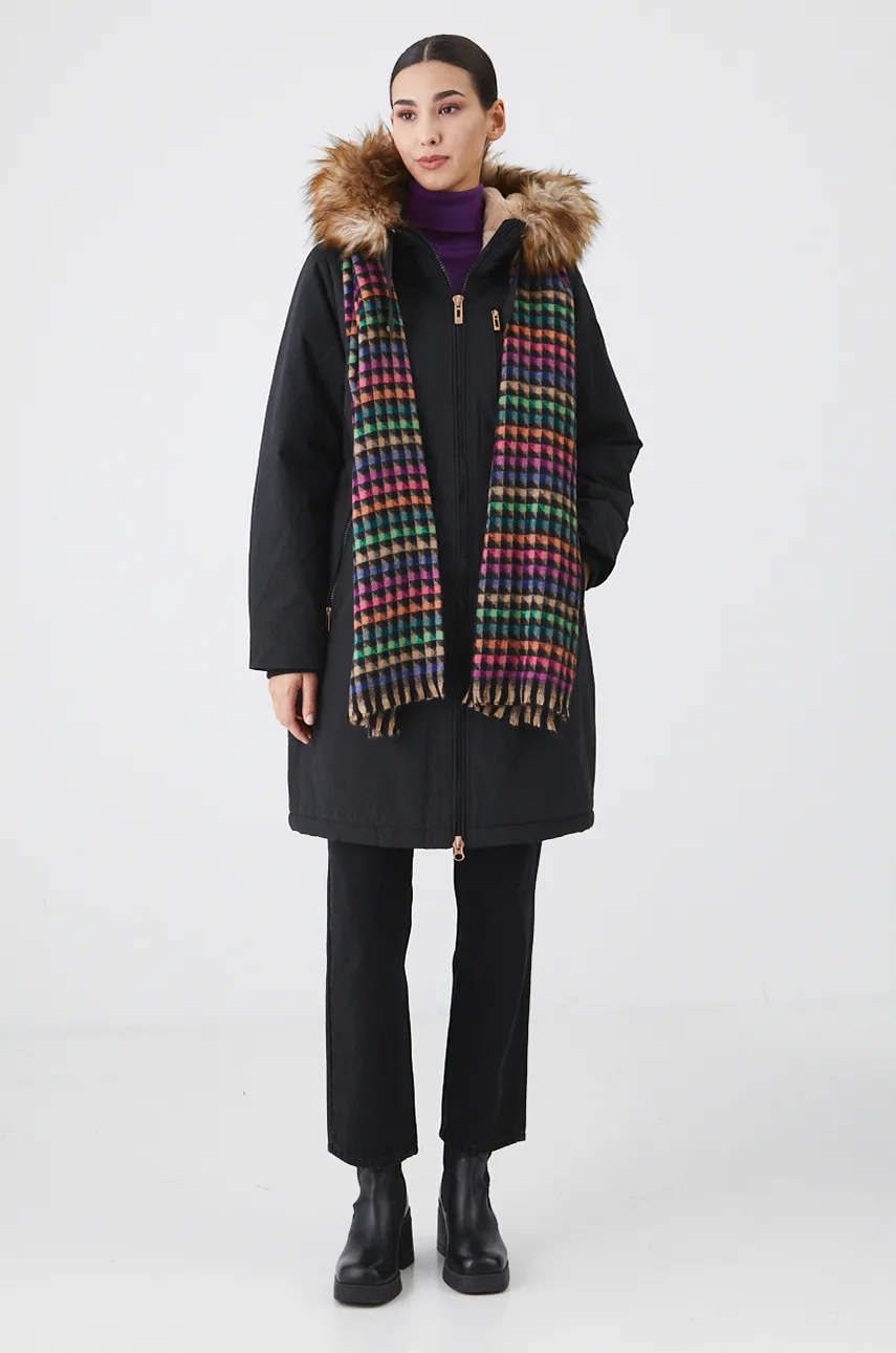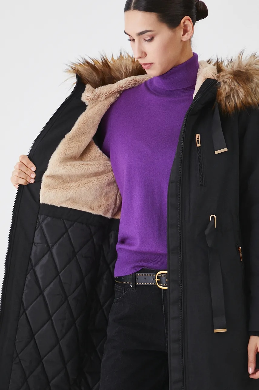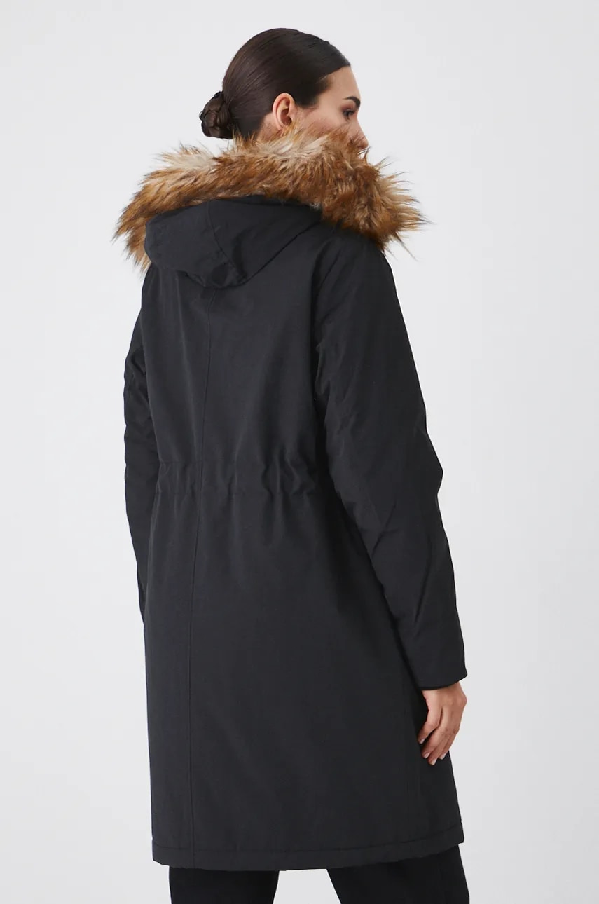 - Fason regular. - Długi rękaw. - Rękawy wykończone ściągaczem. - Zapięcie na dwustronny suwak. - Kaptur ściągany troczkami. - Kaptur ze sztucznym futerkiem. - Dwie wsuwane i zapinane na suwak kieszenie boczne. - Kieszonka na piersi zapinana na suwak. - W pasie regulacja szerokości za pomocą troczków. - Ocieplony model na podszewce. - Gładki materiał. - Długość rękawa: 62,5 cm. - Długość: 95 cm. - Szerokość w biuście: 57 cm. - Szerokość w barkach: 43 cm. - Wymiary podane dla rozmiaru: S.