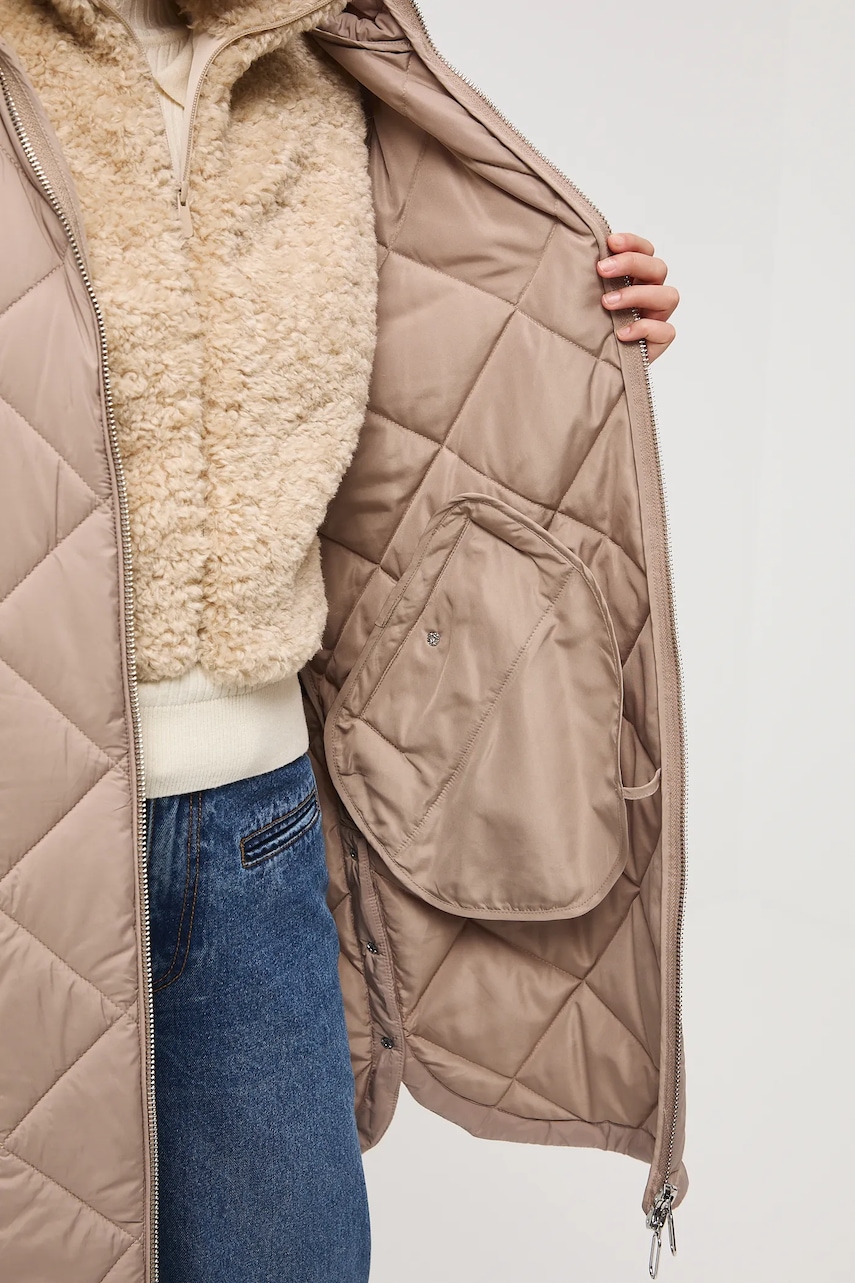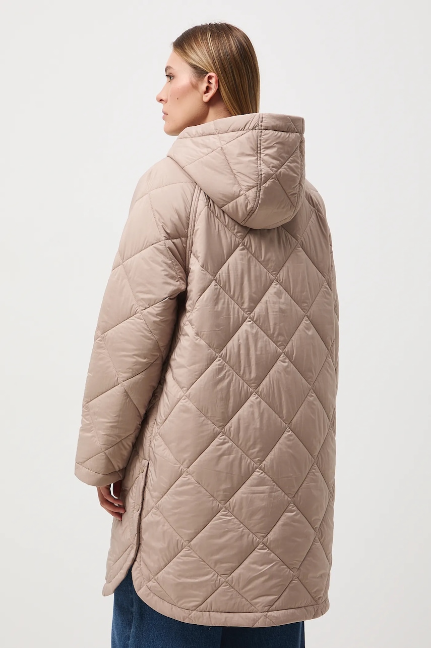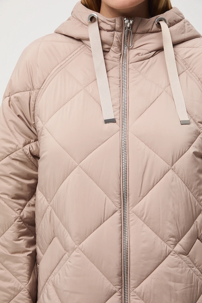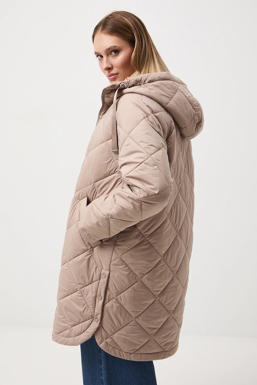 - Fason oversize. - Długi, raglanowy rękaw. - Kaptur ściągany troczkami. - Zapięcie na dwustronny suwak. - Wsuwane i zapinane na zatrzaski kieszenie boczne. - Po bokach rozcięcia zapinane na zatrzaski. - Lekko ocieplony model na podszewce. - Pikowany model. - Długość rękawa(mierzona od kaptura): 74 cm. - Długość: 95 cm. - Szerokość w biuście: 58,5 cm. - Wymiary podane dla rozmiaru: S.