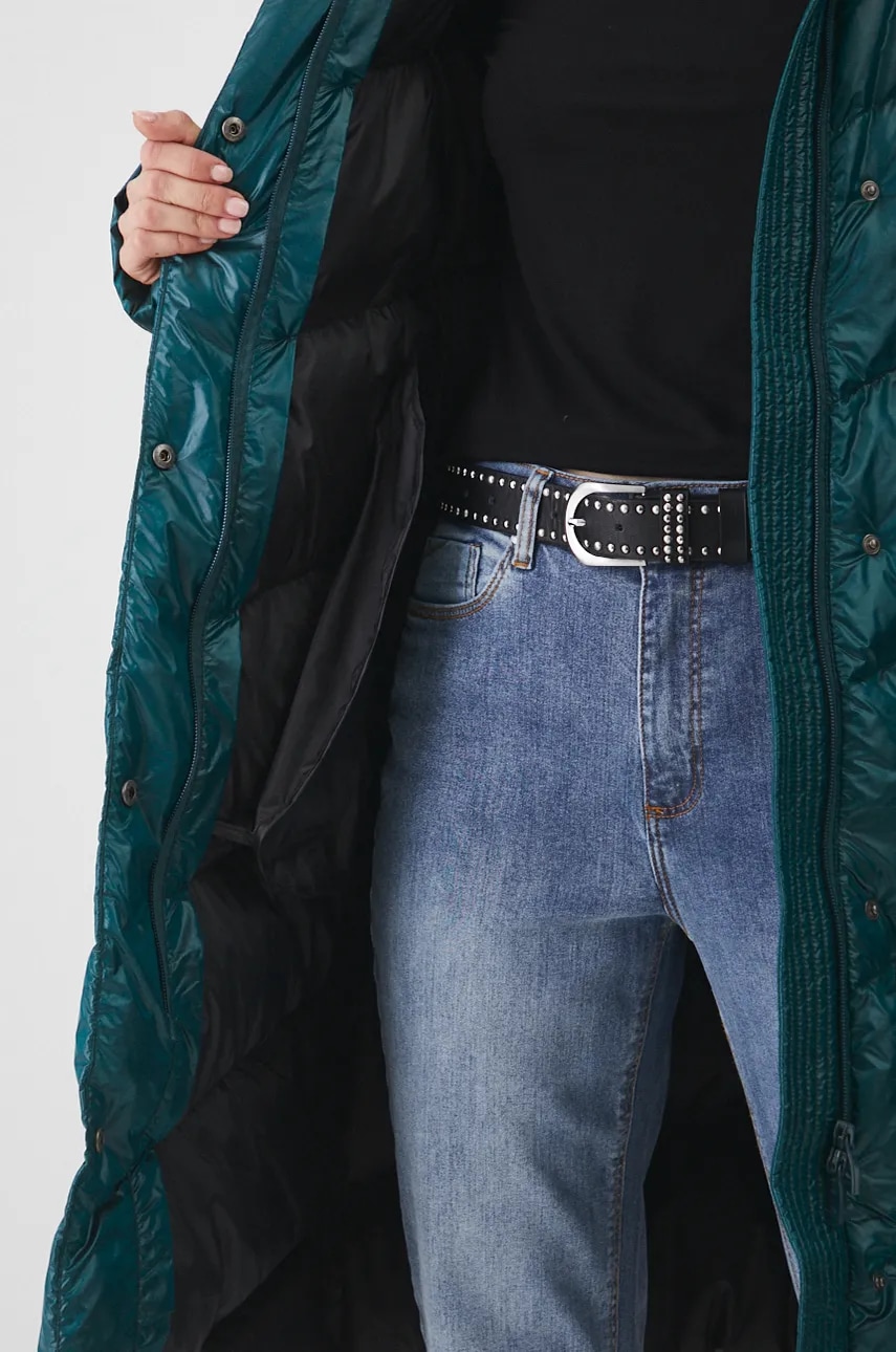 - Fason regular. - Zapięcie na suwak i zatrzaski. - Podwyższony kołnierz. - Nieodpinany kaptur. - Wsuwane kieszenie zewnętrzne. - Ocieplony model na podszewce. - Wypełnienie z naturalnego puchu i pierza. - Pikowany model. - Długość rękawa: 64,3 cm. - Długość: 106 cm. - Szerokość pod pachami: 56 cm. - Szerokość w ramionach: 44 cm. - Wymiary podane dla rozmiaru: S.