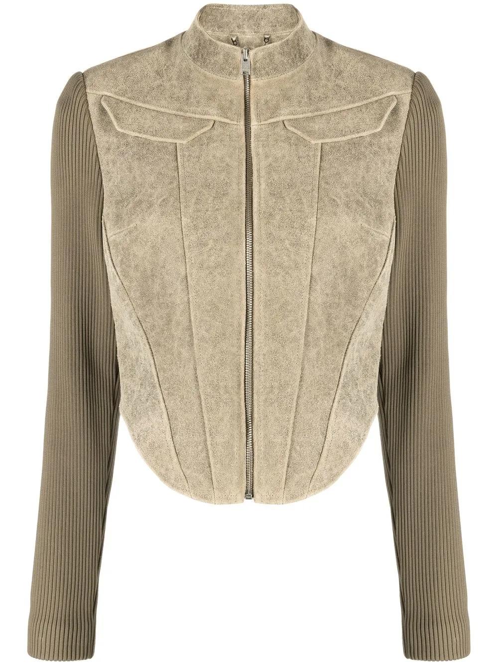 taupe calf leather contrasting-fabric sleeves long sleeves mock neck front zip fastening asymmetric hem