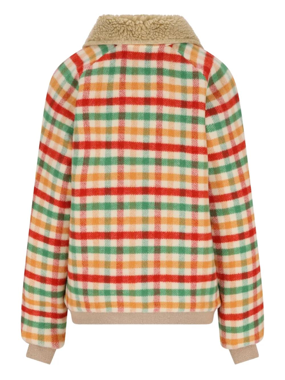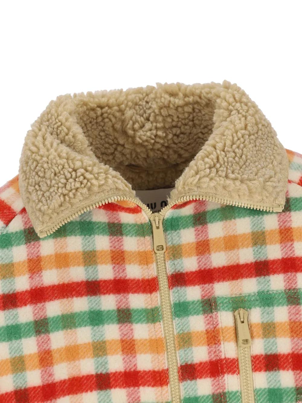 multicolor check pattern fleece texture zip fastening sherpa collar side pockets logo patch