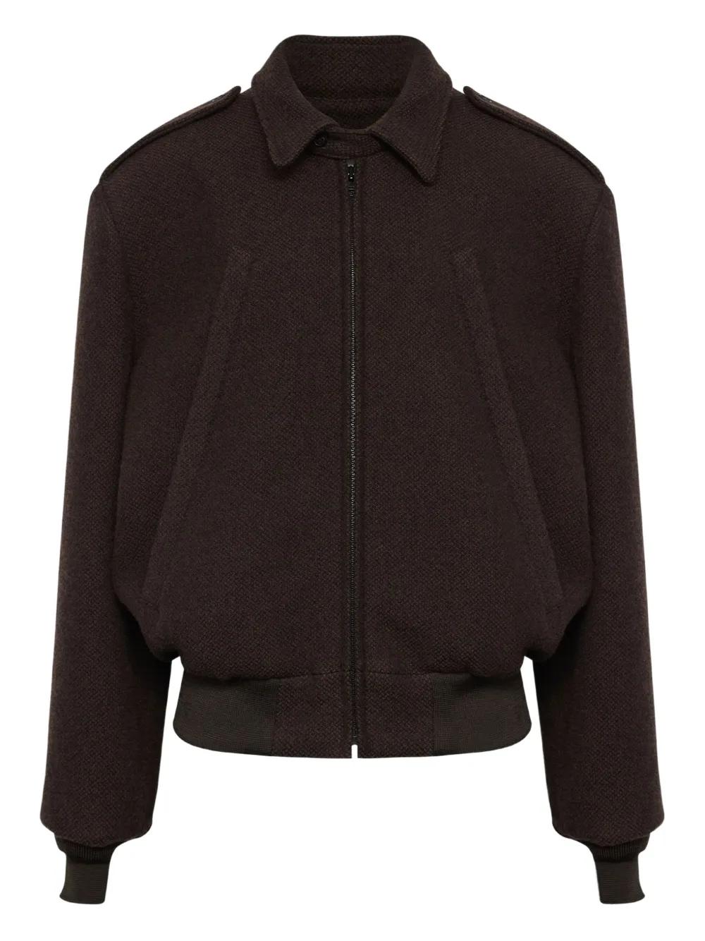 dark brown zip fastening shoulder epaulets ribbed cuffs slightly gathered sleeves