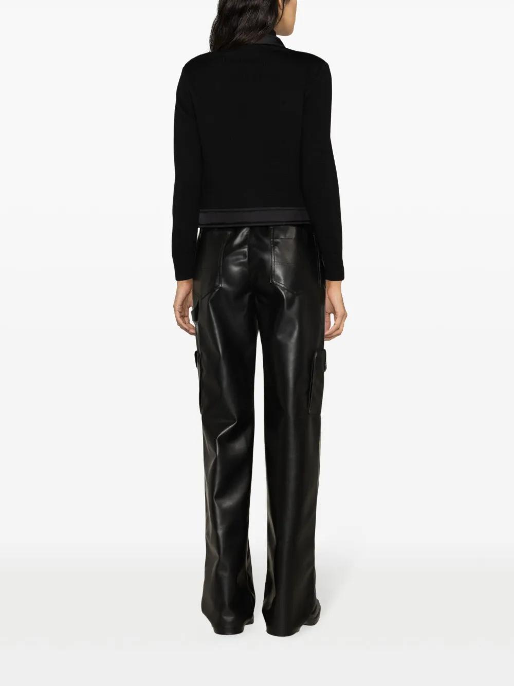 jet black virgin wool ribbed knit tricot knit insulated design logo patch at the chest high neck front press-stud and zip fastening long sleeves ribbed cuffs two side zip-fastening pockets straight hem full lining