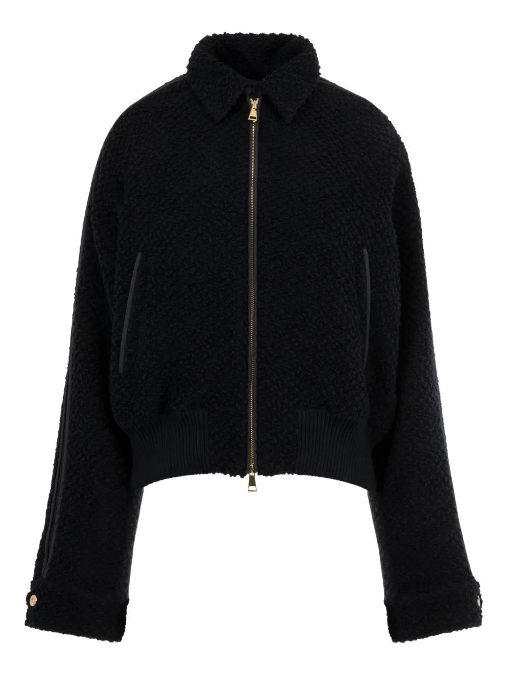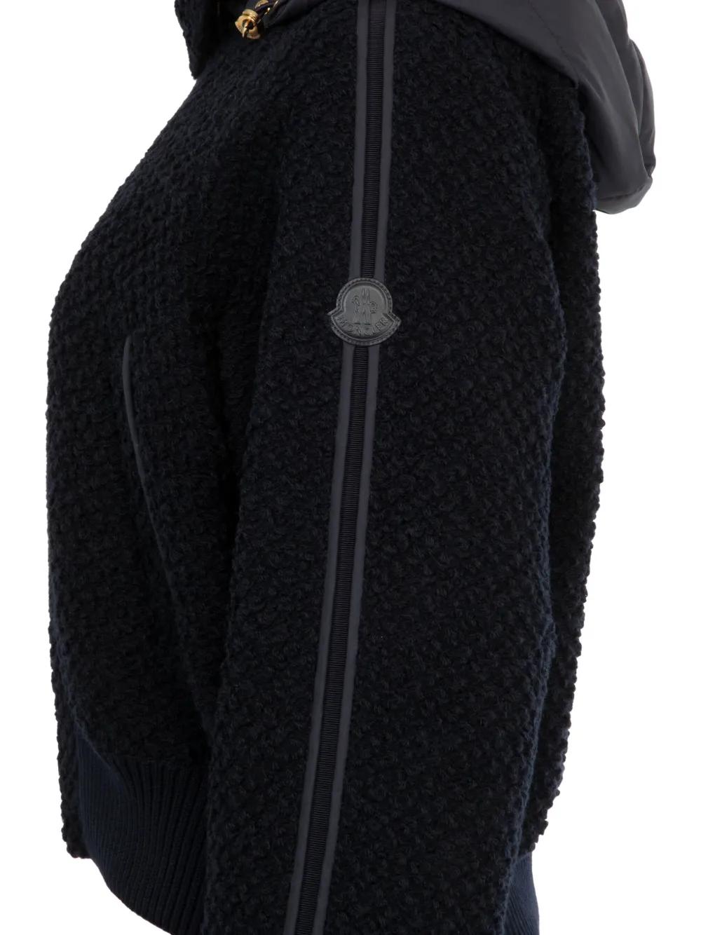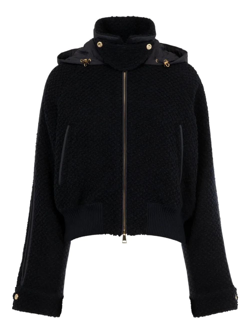 navy blue bouclé texture concealed zip fastening ribbed hem ribbed cuffs detachable hood sleeve panelling