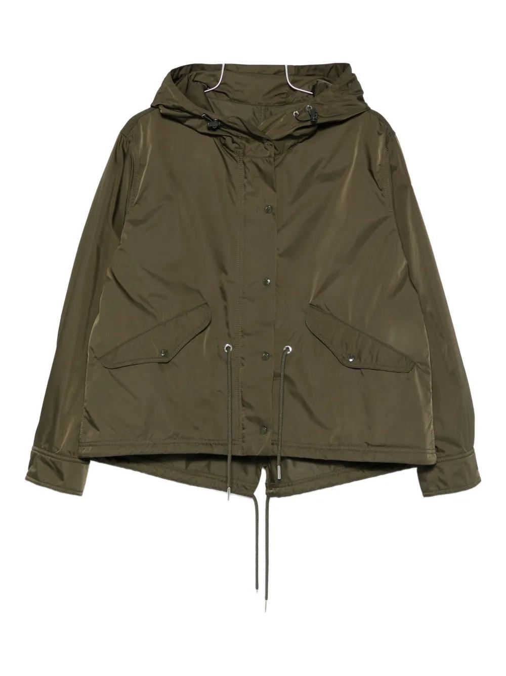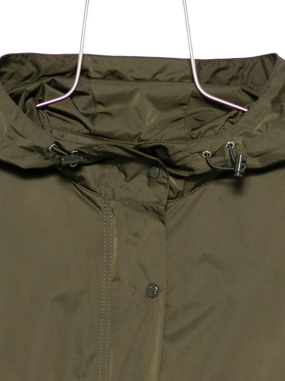 green drawstring hood front flap pockets drawstring hem press-stud fastening long sleeves