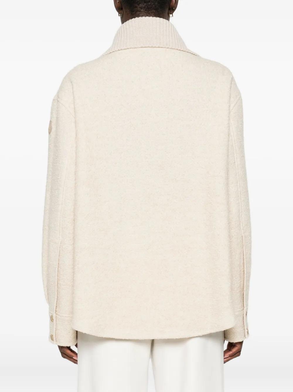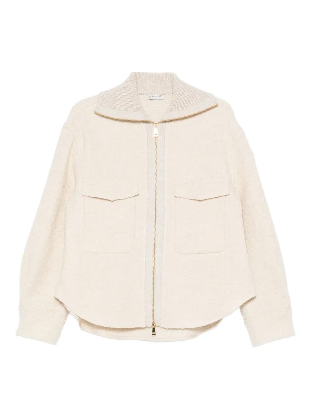 beige bouclé construction front zip fastening spread collar two chest patch pockets long sleeves