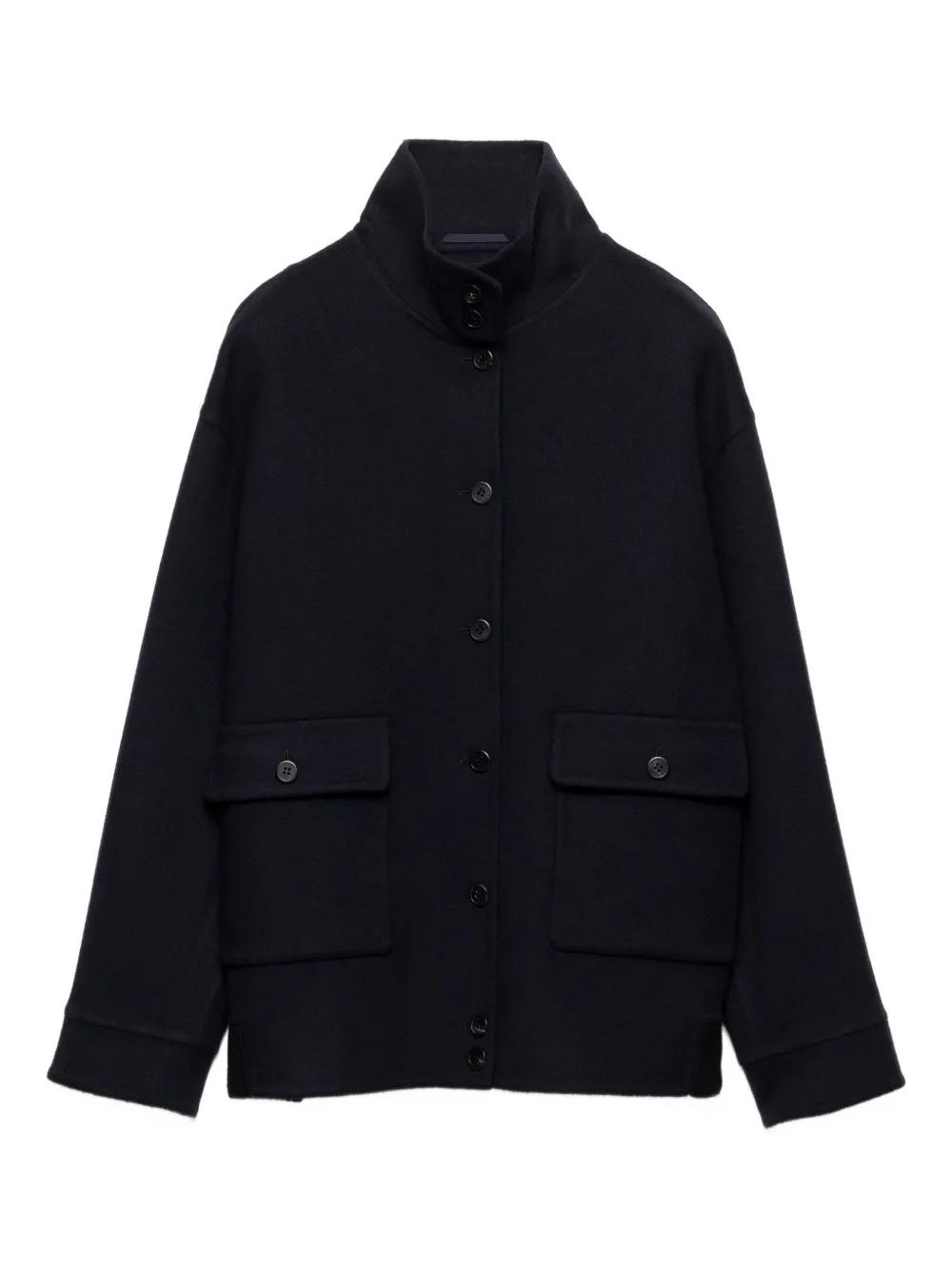 blue stand-up collar buttoned cuffs front button closure patch pockets