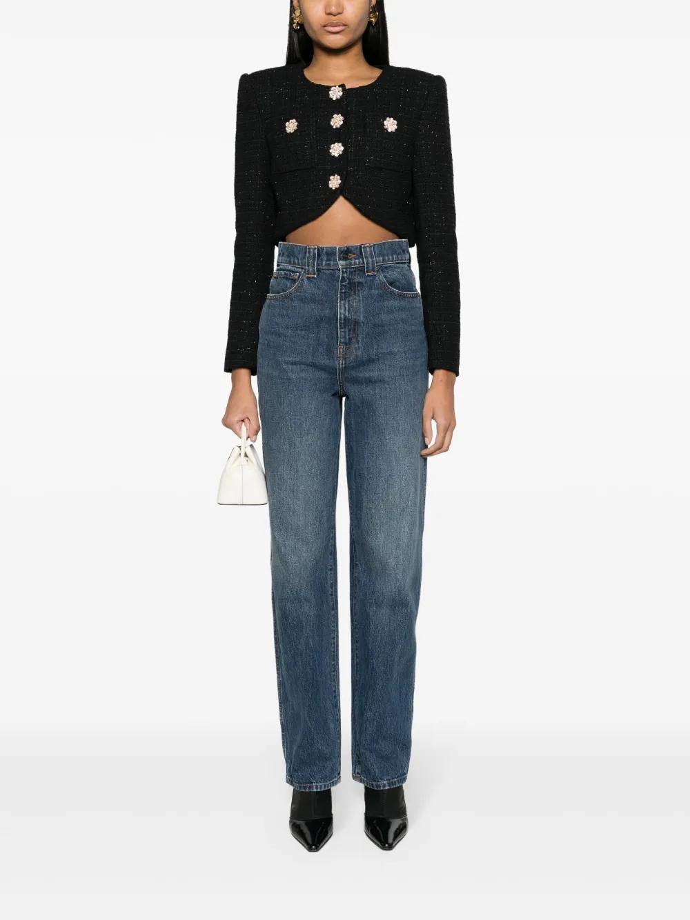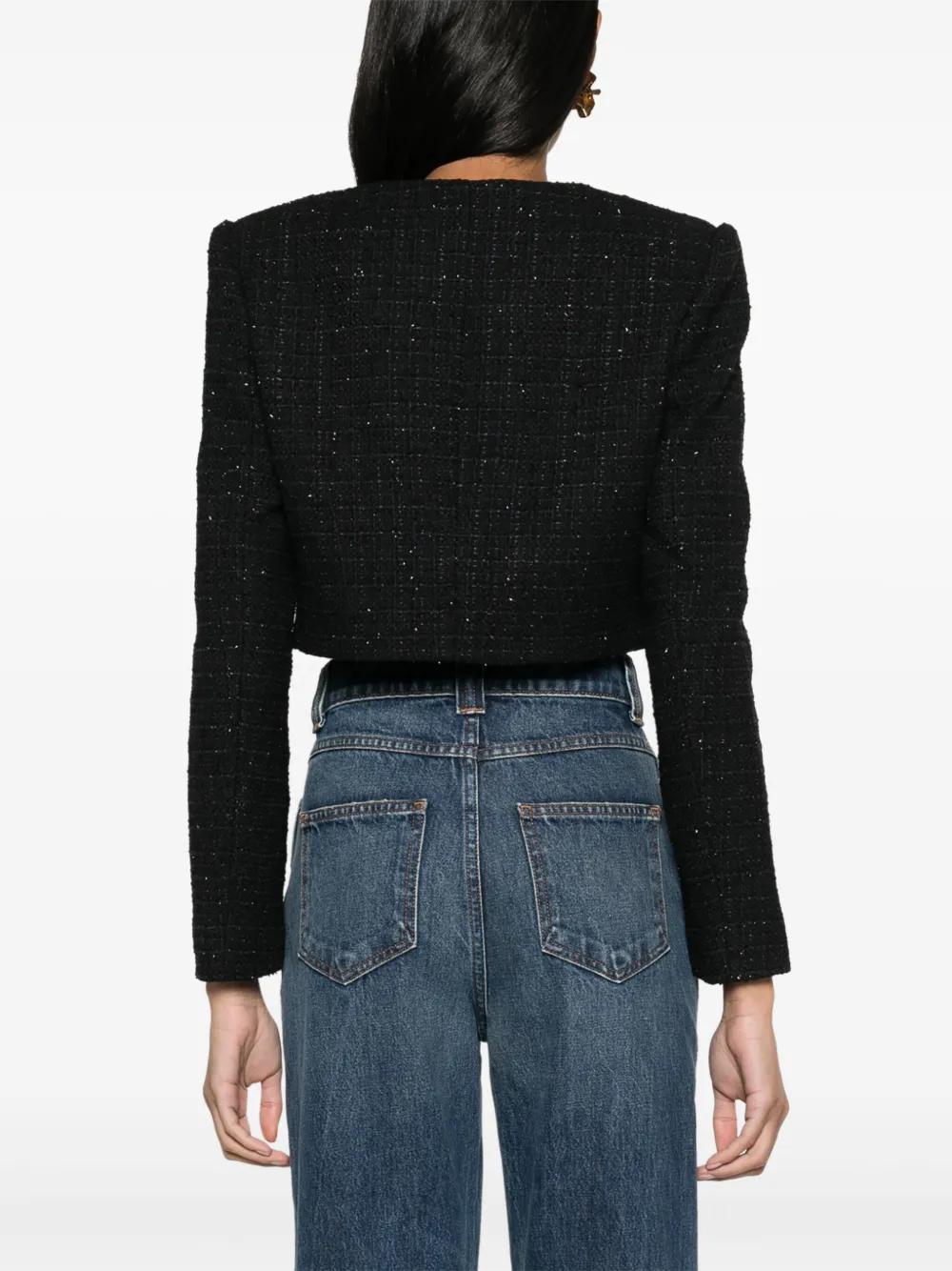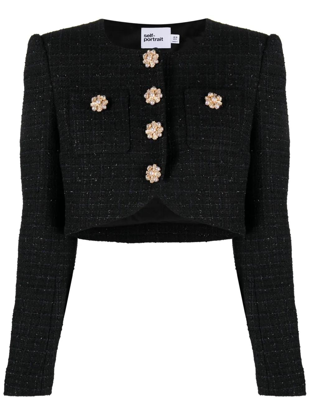 black/navy blue bouclé construction metallic threading faux-pearl buttons round neck front press-stud fastening shoulder pads long sleeves two chest patch pockets asymmetric hem cropped logo-jacquard lining