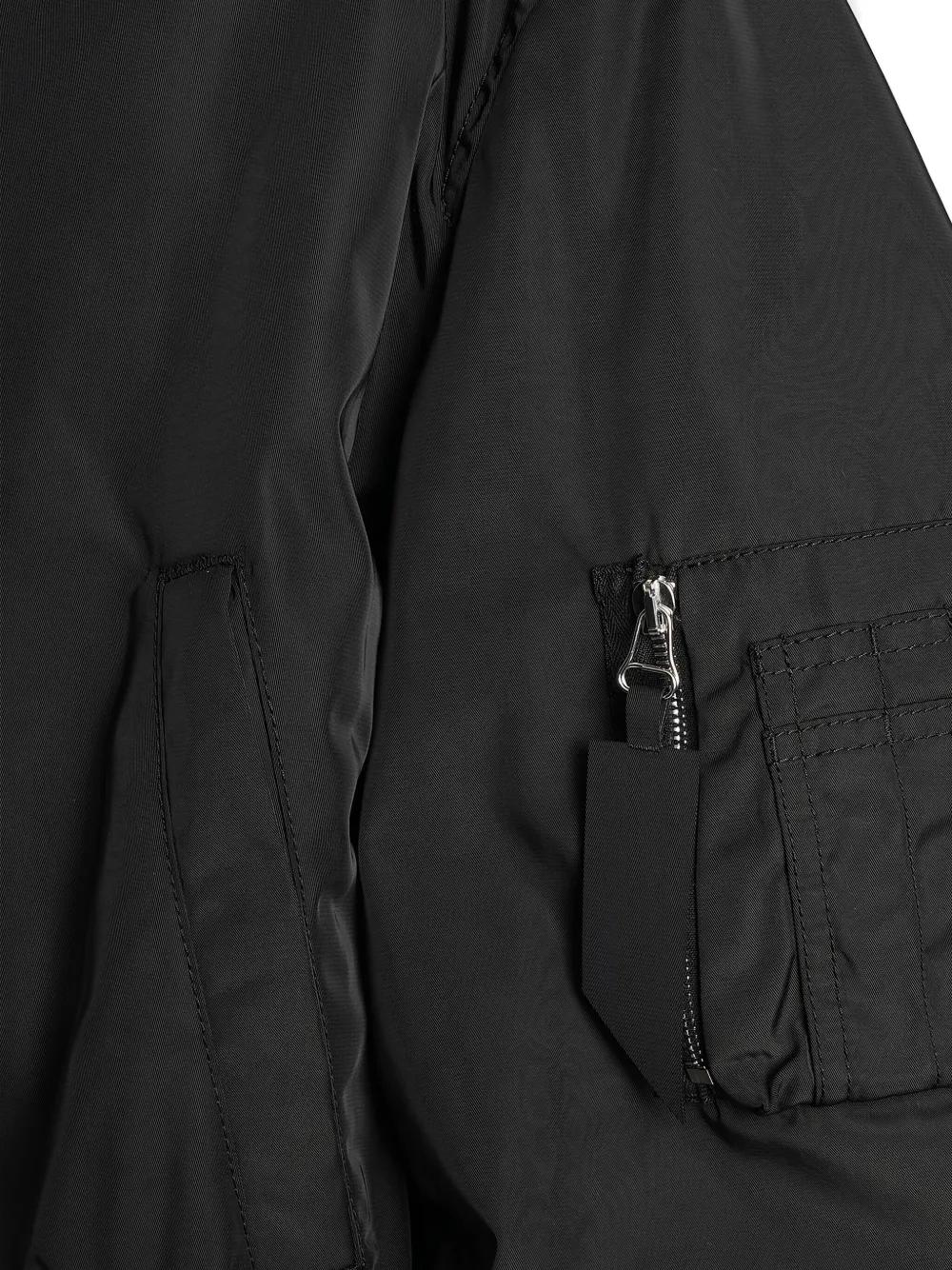 black bomber collar long sleeves zip closure zip pocket on sleeve ribbed cuffs ribbed hem