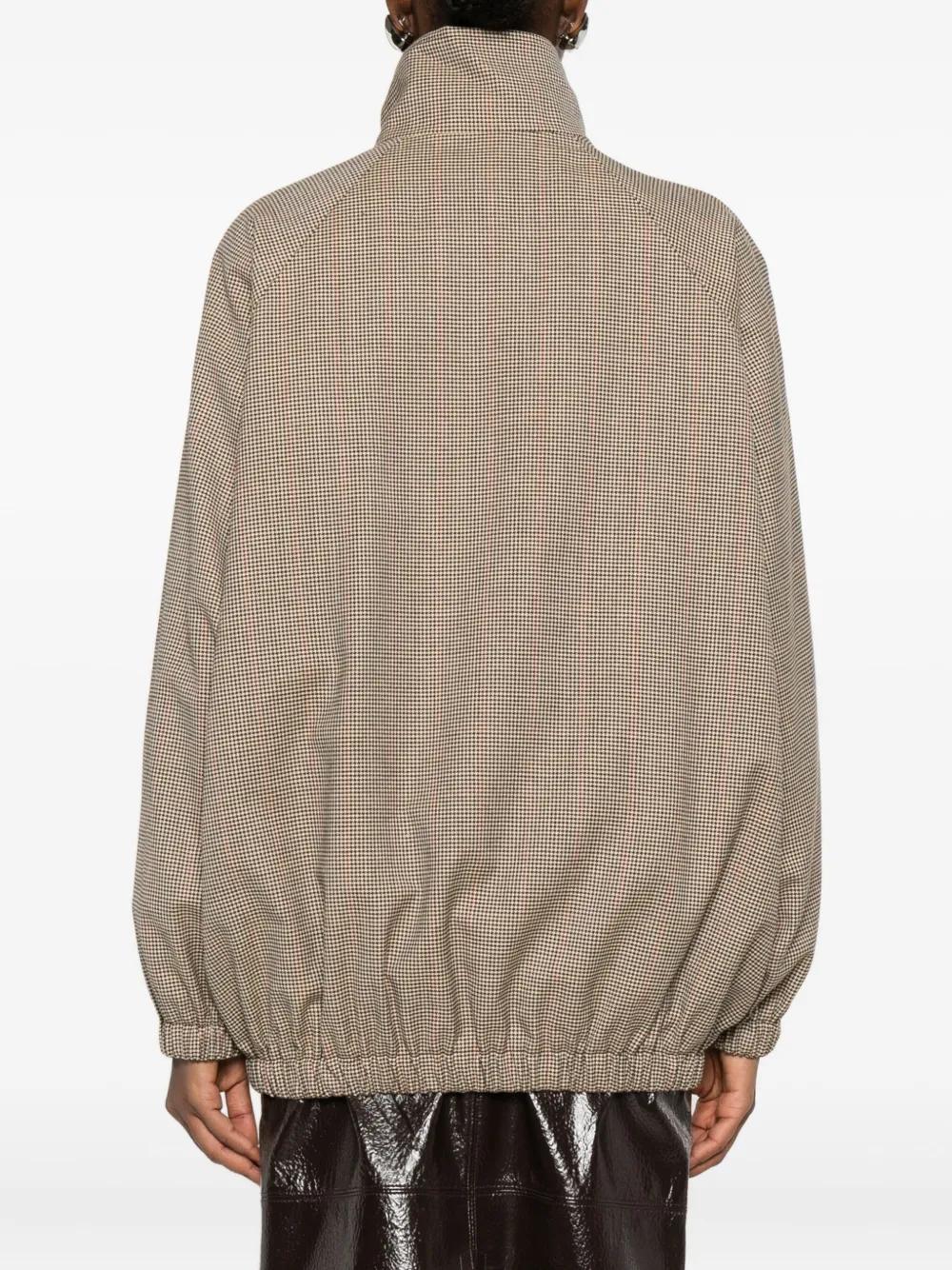 beige houndstooth pattern front button fastening long sleeves high neck side slit pockets elasticated cuffs and hem