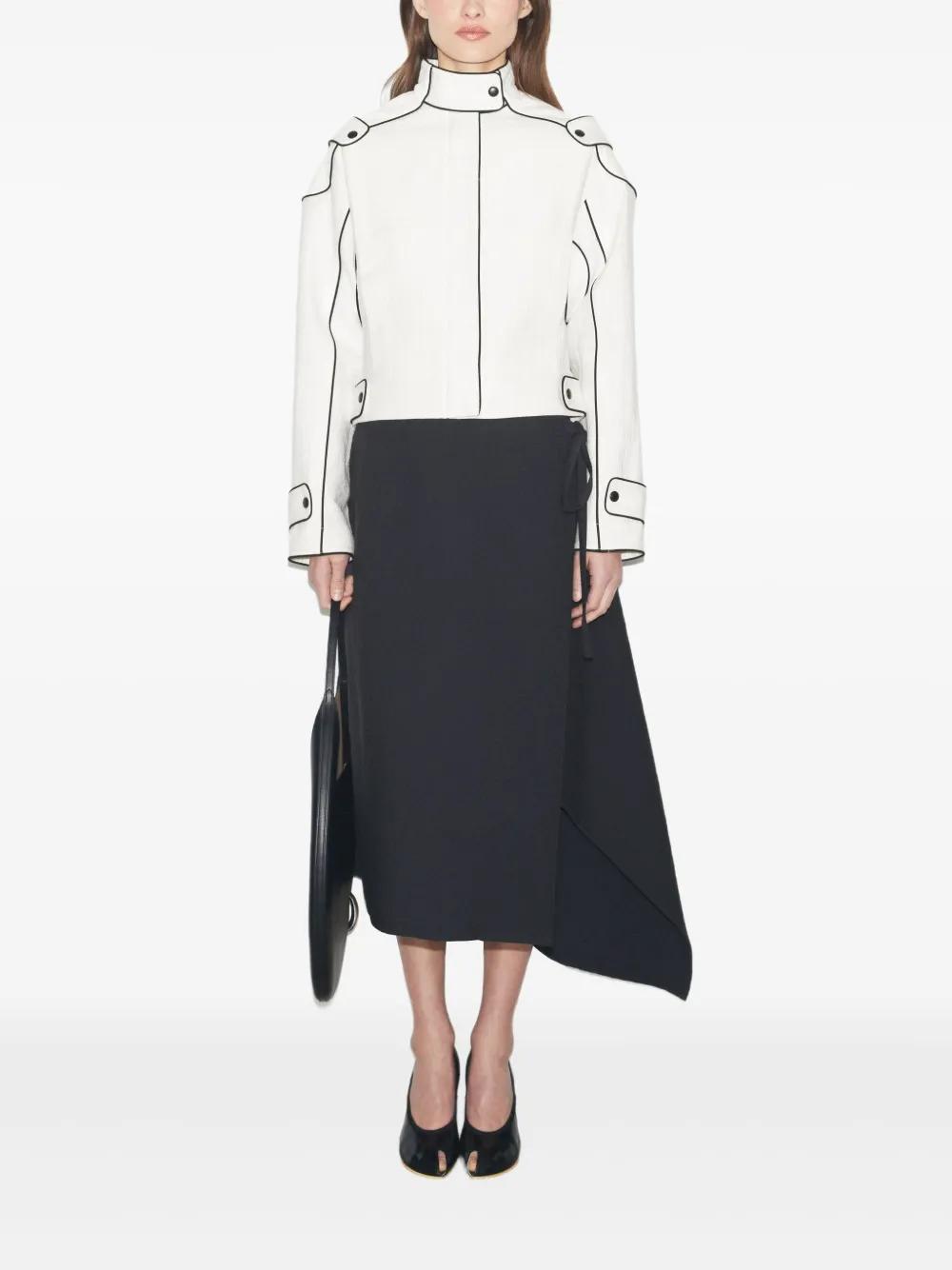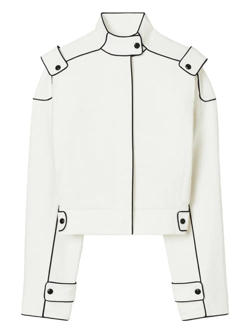 white contrast piping high collar shoulder epaulettes button details on sleeves front zip closure