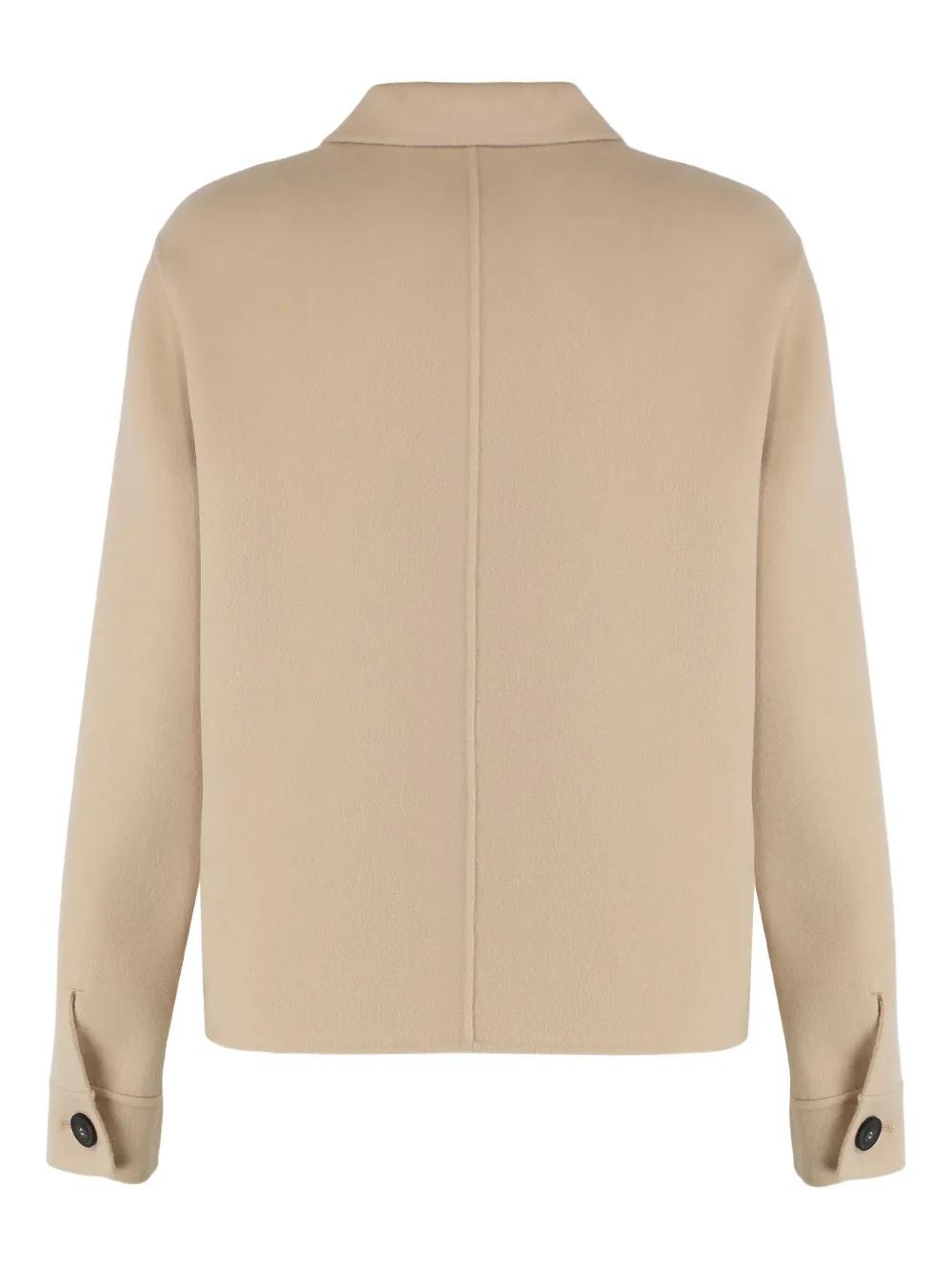 beige wool fabric button closure patch pocket notched collar long sleeves