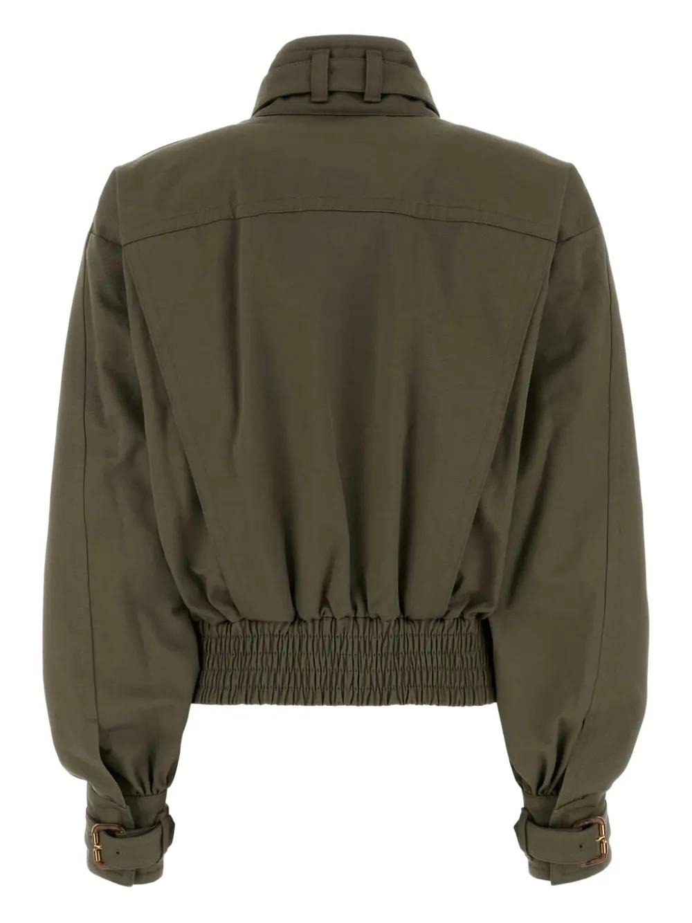 army green cotton front flap pockets buckle detail elasticated hem high neck
