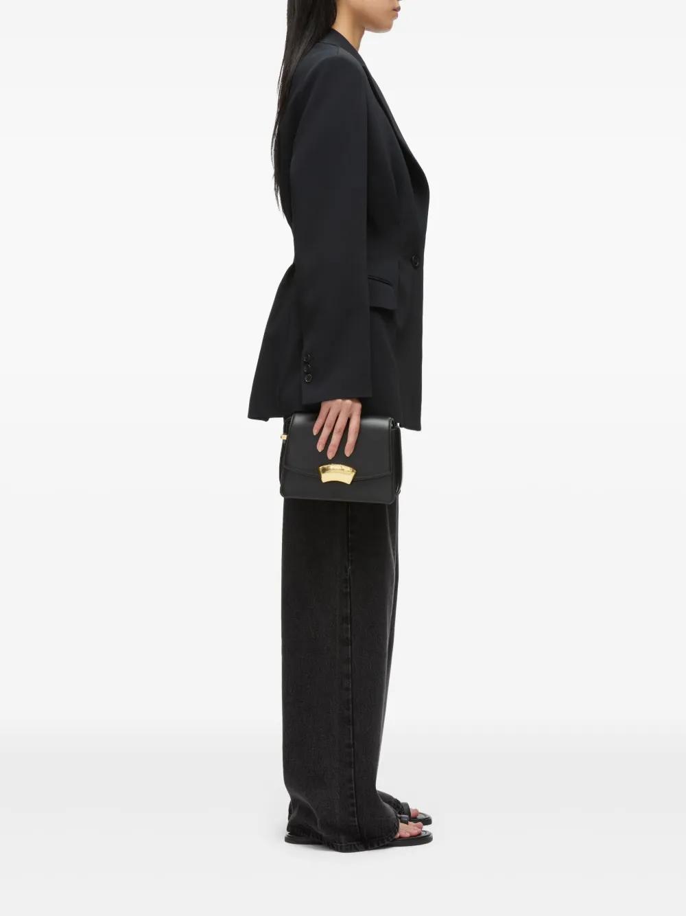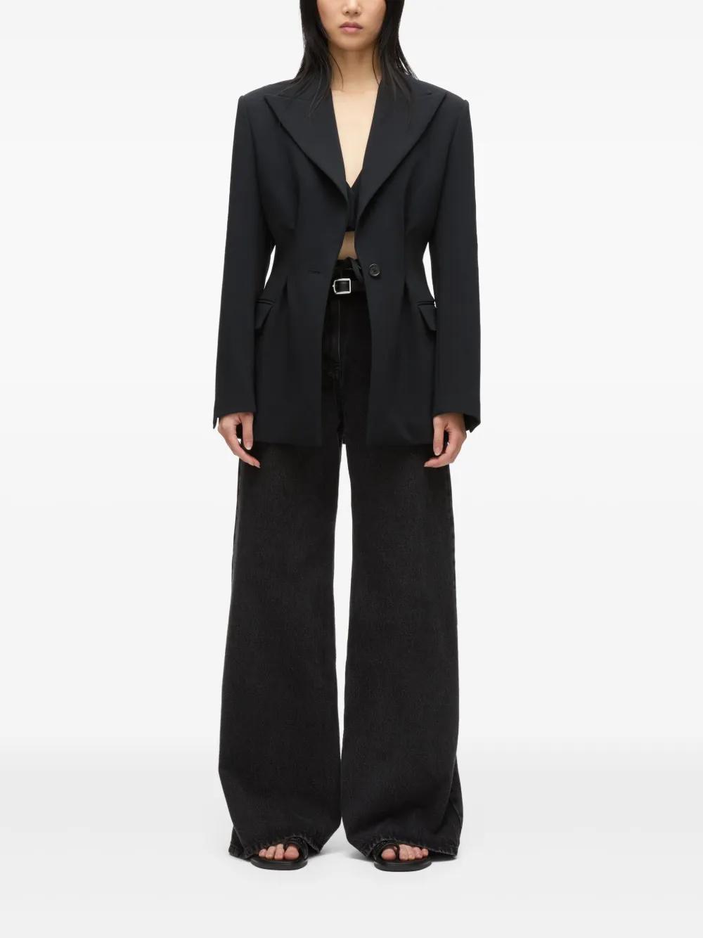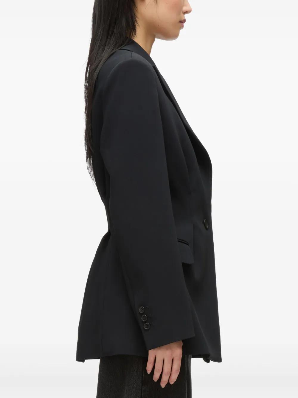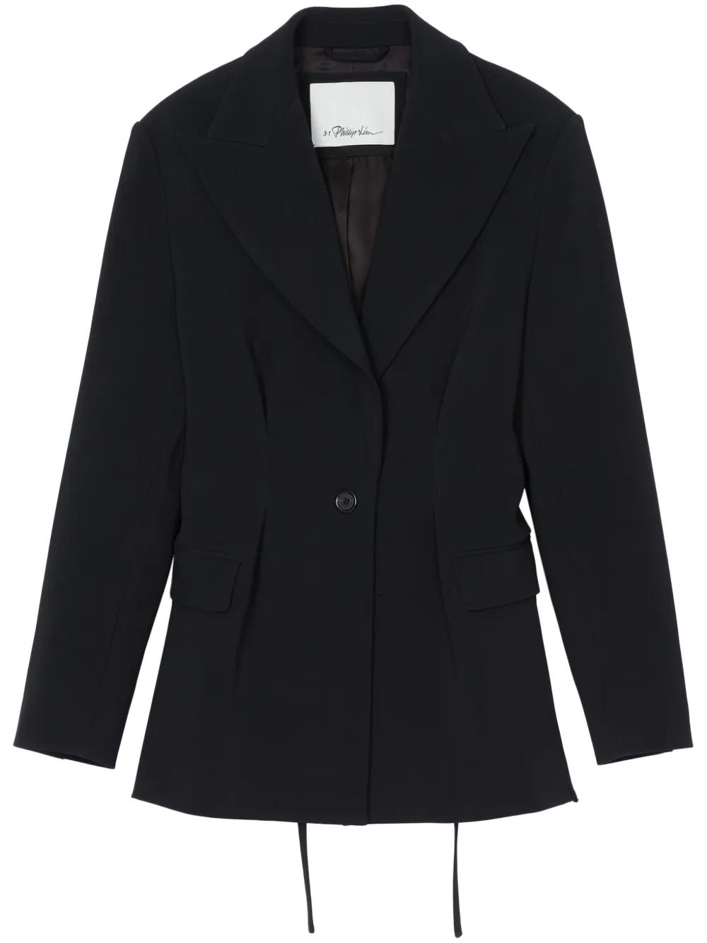 black front button fastening two front flap pockets buttoned cuffs pleat detailing