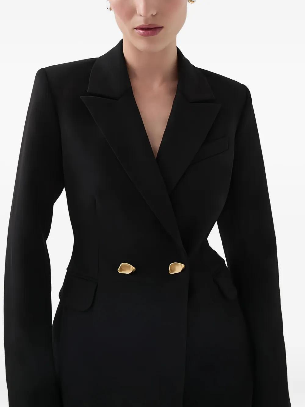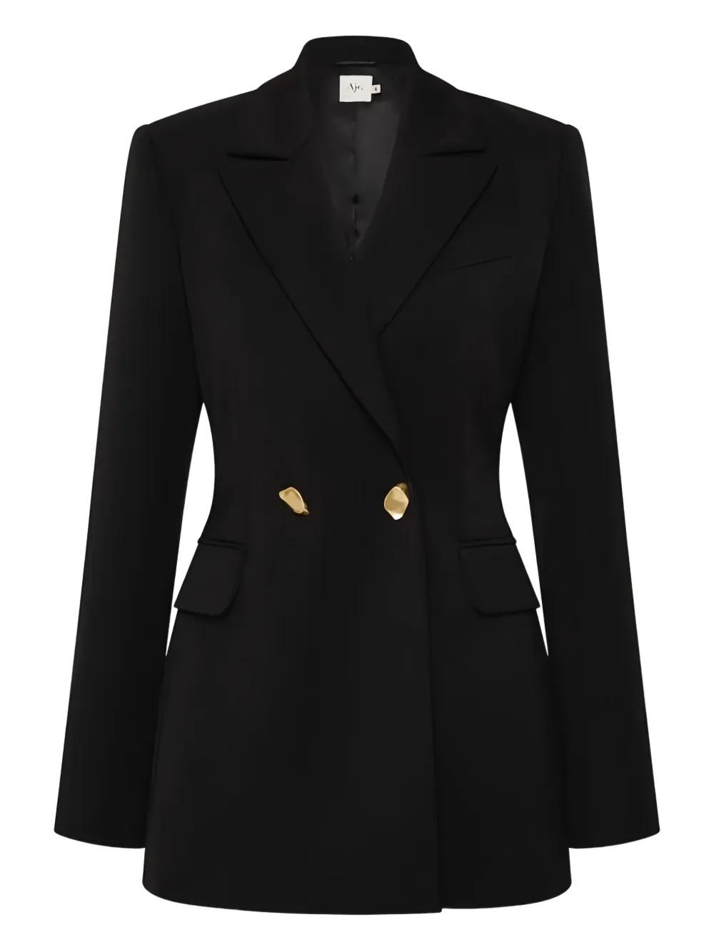 black double-breasted peak lapels front flap pockets gold-tone buttons long sleeves