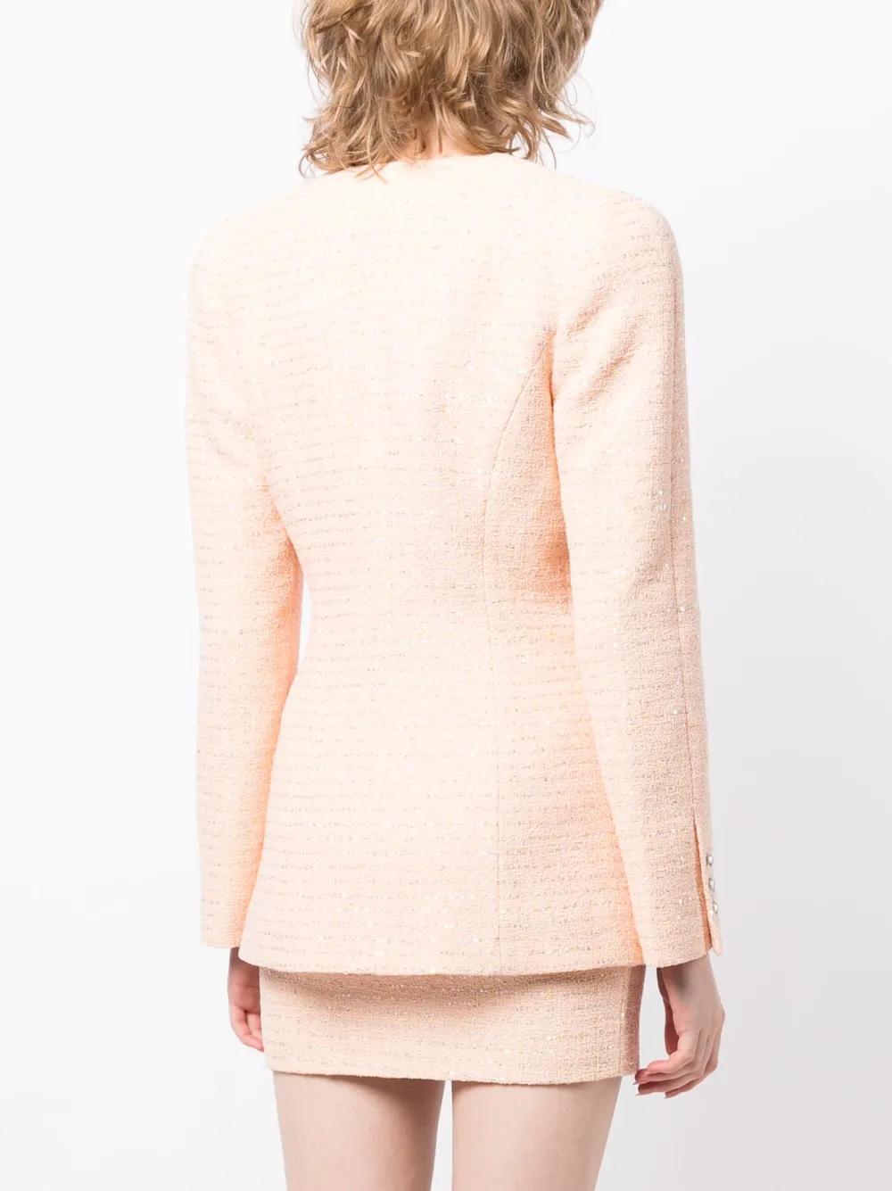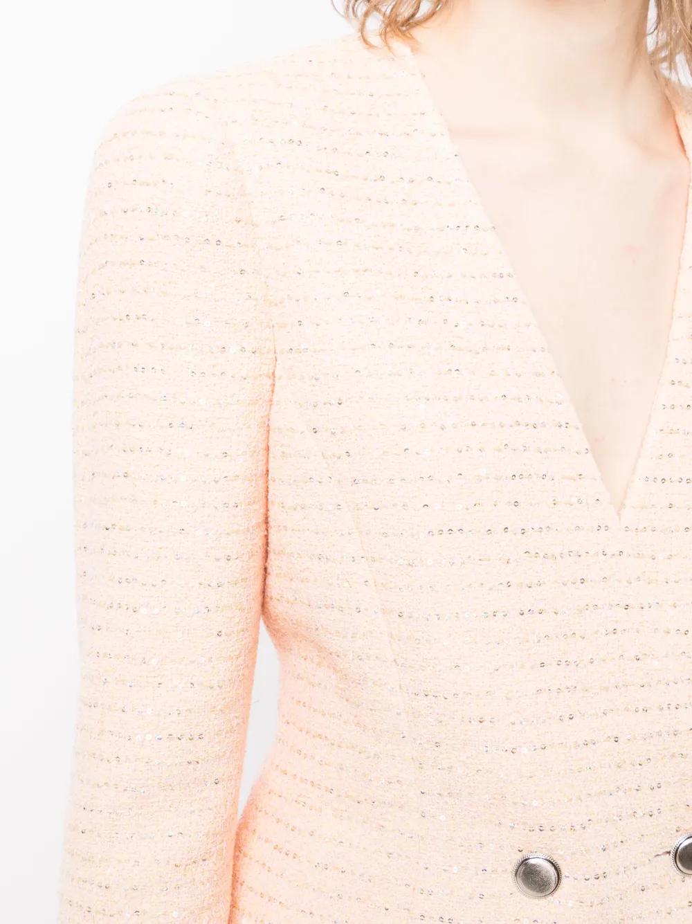 peach pink cotton blend tweed sequin embellishment V-neck double-breasted button fastening long sleeves two side patch pockets straight hem