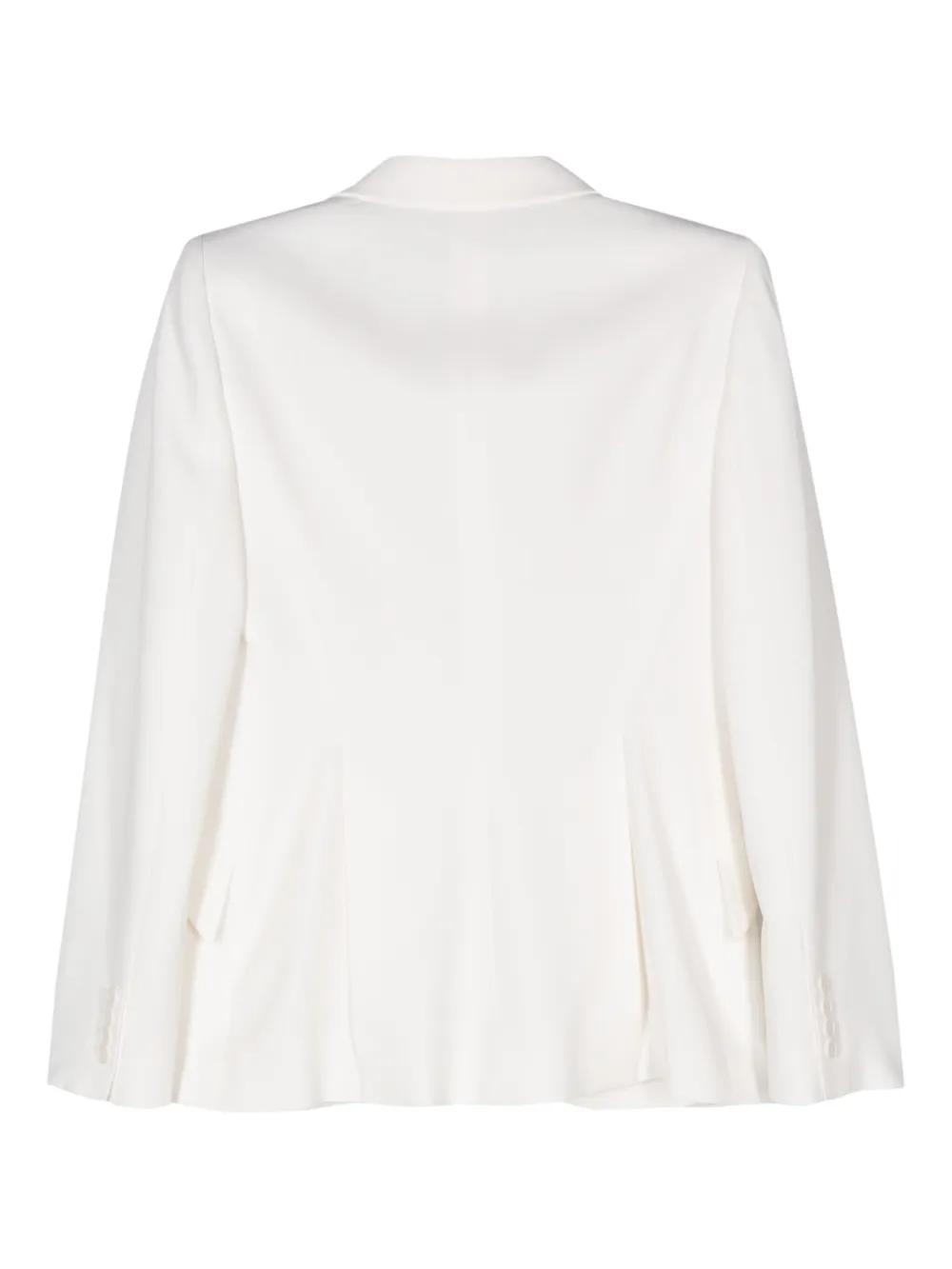 white crepe texture peak lapels shoulder pads long sleeves chest welt pocket front flap pockets satin lining front button fastening