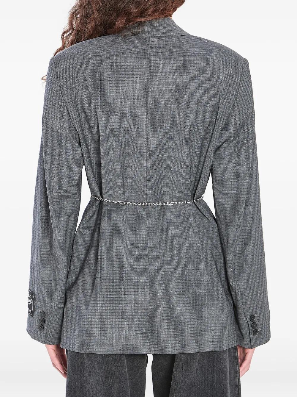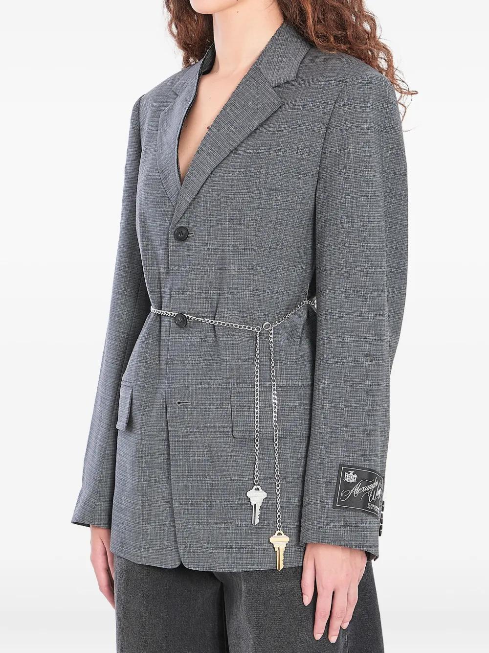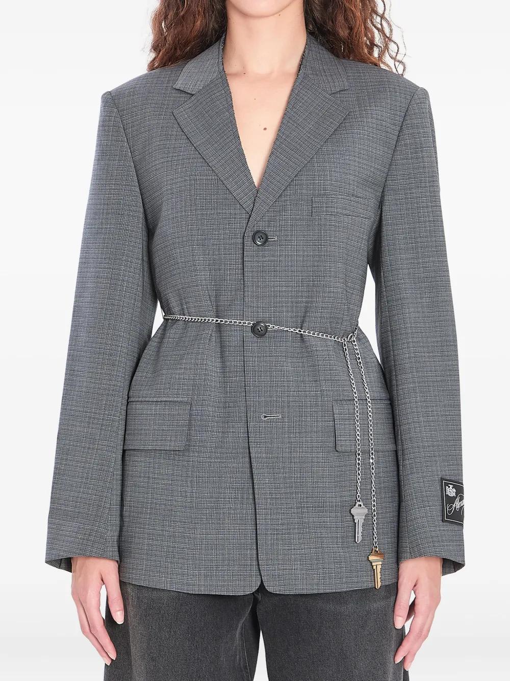 grey notched lapels welt and flap pockets three-button closure removable chain belt key-shaped charm