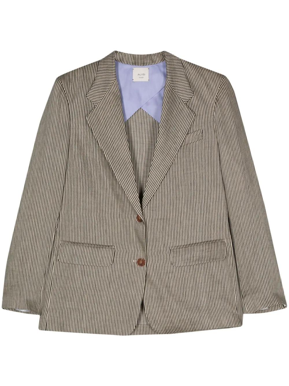 black/beige linen blend vertical stripe pattern shoulder pads notched lapels chest welt pocket long sleeves buttoned-cuff sleeves two front flap pockets partial lining front button fastening